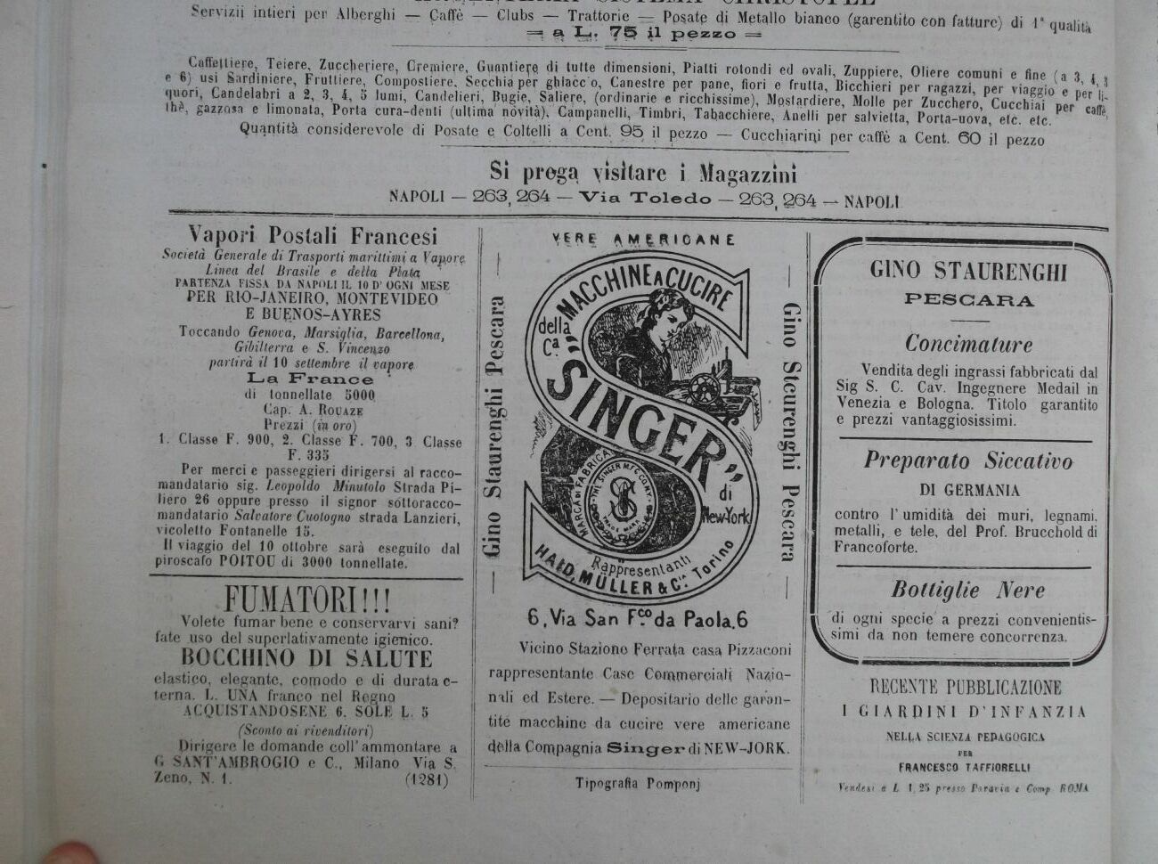 Vicino Staziono Forgia casca Pizzaconi rappresentante Case CemmoroiaN ^a&io-nali ed Estere. Depositario delle garan^ tité macchino da cucire vere americane I (falla Compagnia Singer* di NE W-JORK.
