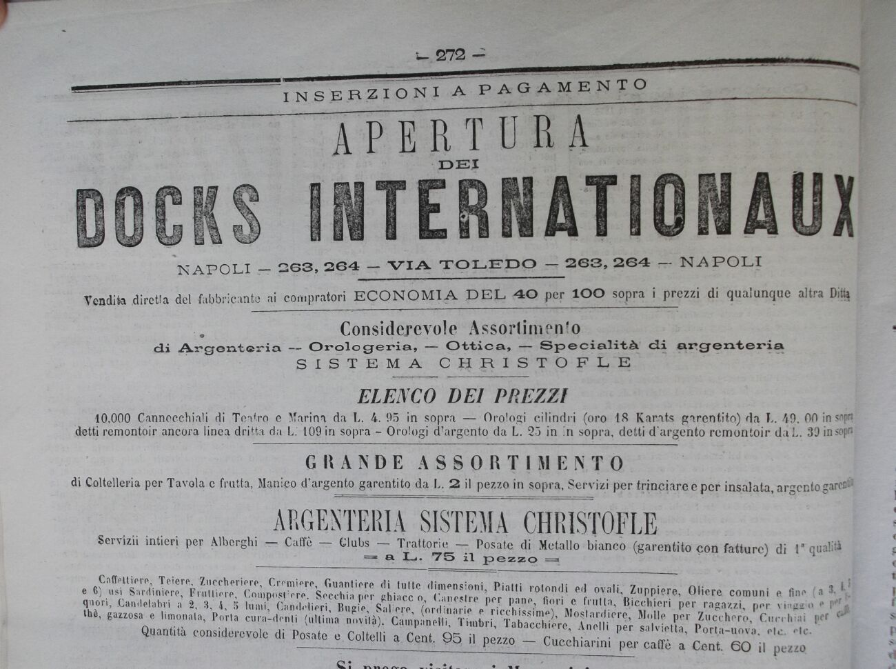 10,000 Cannocchiali di Teatro e Marina da L. 4. 95 in sopra Orologi cilindri (oro 18 Karats garentito) da L. 49, 00 in sopri detti remontoir ancora linea dritta da L. 109 in sopra - Orologi d'argento da L. 25 in in sopra, detti d'argento remontoir clai. 39 insopn