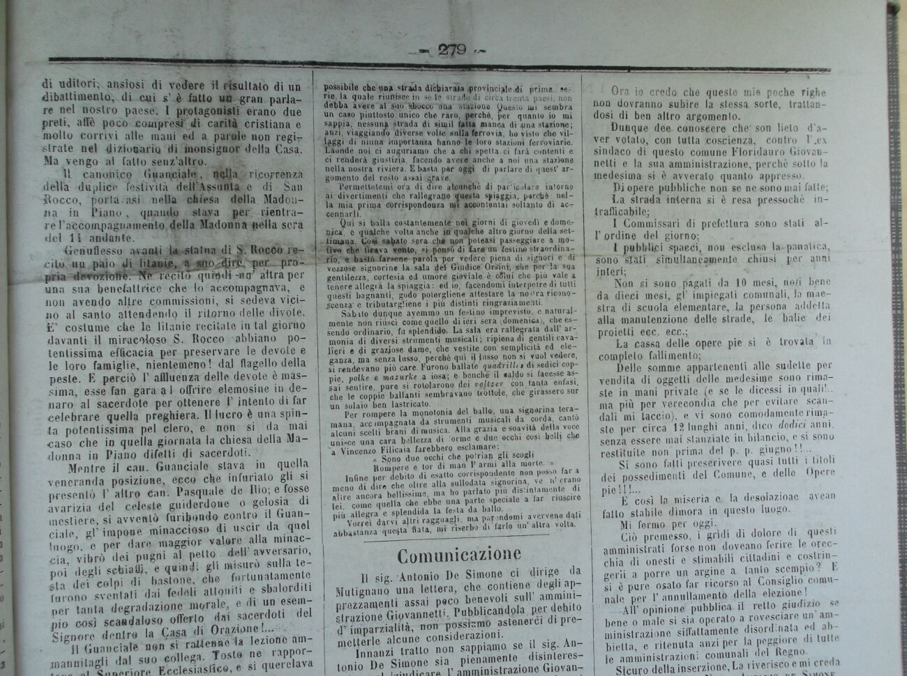 Mentre il caia. Guanciale slava in quella veneranda posizione, ecco che infuriato gli si presentò I1 altro can. Pasquale de Ilio; e fosse avarizia del celeste guiderdone o gelosia di mestiere, si avventò furibondo eonlro il Guanciale, gP impone minaccioso di uscir da quel luogo, e per dare maggior valore alla minaccia, vibrò dei pugni al petlo dell' avversario, poi degli sefeiaÙj, e quindi gli misurò sulla testa dei colpi di bastone, ehe fortunatamente furono sventali dai fedeli attoniti e sbalorditi per tanta degradazione morale, e di un esempio così scandaloso offerto dai sacerdoti del Signore (lenirò la Casa di Orazione!... 11 Guanciate non si rai-teniióla lezione am-jnannitagli da! suo collega. Tosto ne rappor-4..... -»» Cnnoriore Ecclesiastico, e si querelava « 27© - possibile che un» strada dichiarala provinciale .di prima serie, la quale riunisce in sò ie strado di circa trenta paesi, non de'l>ba avere al suo sbocci* 'una stazione Questo mi sembra un caso piuttosto unico Che raro, perchò, per quanto io mi sappia, nessuni strada di simil fitta manca di .una stazione; anzi- viaggiando diverse volte sulla ferrovia, ho visto che vii rl'aggi di ninna importanza hanno le loro stazioni ferroviarie. Laonde noi ci auguriamo che a chi spetta ci fari contenti e ci renderà giustizia, facendo avere anche a noi una stazione nella nostra riviera. E basta per oggi di parlare di quest' argomento del resto assai a ve. Permettetemi ora di dire alcunché di par'inalare intorno ai divertimenti cho rallegrano questa spiaggia, pardiè nella mia prima corrisppndouza mi aceonl«ntai soltanto di accennarli. » ' Qui si balla costantemente nei giorni di giovedì e domenica, e qualche volta anche in'qualche altro giorno della settimana. Cosjt sabato sera .che non potessi passeggiare a moli w ehe tirava vento, si pensò di fare un festino straordinario, e bastò farsene parola per vedere piena di signori e di vezzose signorine la sala del Giudice Oriinfr, ehe per la sua gentilezza, cortesia ed umore gioviale è cBlui che più vale a tenere allegra la spiaggia: ed io, facendomi iuterpclre di tutti questi bagnanti, godo potergliene attestare la no>'ra risono-^ccnza e tributargliene i più distinti ringraziamenti. Sabito dunque ayemmo un festino imprevisto, e naturalmente non riusci come quello di ieri sera ^domenica), che essendo ordinario, fu splendido- La sala era rallegrala dall' armonia di diversi strumenti musicali; ripiena di gentili cavalieri e di graziose dame, che vestite con semplicità ed eleganza, ma senza lusso, perchè qui il lusso non si vuol vedere, si rendevano più care. Furono ballate quadrili* $ di sedici coppie, polke e ma zurli e a iosa; e benché il «aldo si facesse assai sentire, pure si rotolarono dei vii}toer con tanta enfasi, ehe le coppie ballanti sembravano trottole, ehe girassero sur un sulaio ben lastricato. Per rompere la nKjnotonia del ballo, una signorina teramana, accompagnata da strumenti musicali da corda, cantò alcuni scelti brani di musica. Alla grazia e soavità della voce unisce una cara bellezza di 'orme e due occhi così b^Ilf che a Vincenzo Filicaia farebbero esclamare: « Spno due occhi che potrian gli scogli Rompere e tor di man IJ armi alla morte. » Infine per debito di esatto corrispondente non posso far a meno di dire che olire alla sullodata signorina, ve n' erano altre ancora bellissime, ma ho parlato più distintamente di lei, come quella cbe ebbe una parte speciale a far riuscire più allegra e splendida la festa da ballo. Vorrei darvi apri ragguagli, ma parandomi averveno dati abbastanza questa fiata, mi riserbo di ario un'altra volta. Comunicazione Il sig.'Antonio De Simone ci dirige da Mutignano una lettera, che contiene degli apprezzamenti assai peco benevoli su II- amministrazione Qipvannetti. Pubblicandpla per debito Ora io credo che queste mie poche righe non dovranno subire la stessa sorte, trattandosi di ben altro argomento. Dunque dee conoscere che son lieto d'aver votato, con tutta .coscienza, contro l'.ex sindaco di questo comune Fiondatiro Giovao-netti e la sua amministrazione, perchò sotto la medesima si è avverato quanto appresso. Ì, opere pubbliche non se ne sono mai falle; La slrada interna si è resa pressoché in, trafficatile; I Commissari di prefettura sono stati all'ordine del giorno; I pubblici spacci, non esclusa la-panatica, Tono siati simullancapiente chiusi per anni interi; Non si sono pagati da 10 mesi, no/i bene da dieci mesi, gì' impiegali comunali, la maestra di scuola elementare, la persona addetta alla manutenzione delle strade, le balie dei proietti ecc. ecc.; La cassa delle opere pie si è trovata in completo fallimento; Delle somme appartenenti alle sudelle per vendila di oggetti delle medesime sono rimaste in mani private (e se le dicessi in quali!., ma più per verecondia che per evitare scandali mi taccio), e vi sono comodamente rimaste per circa 12 lunghi anni, dico dodici anni, senza essere mai stanziale in bilancio, e si sono restituite non prima del p. p. giugno!!... Si sono falli prescrivere quasi lutti i titoli dei possedimenti del Comune, e delle Opere pie !!!... E così la miseria e la desolazioae avean fallo slabile dimora in questo luogo. Mi fermo per oggi. Ciò premesso, i gridi di dolore di quesli amministrati forse non tloveano ferire le orecchia di onesti e stimabili cittadini e costringerli a porre un argine a tanto scempio? E si è pure osalo far ricorso al Consiglio 'conni-naie per I annullamento della elezione! AH1 opinione pubblica il retto giudizio se bene o male si sia operalo a rovesciare un' amministrazione siffattamente disordinata ed abbietta, e ritenuta anzi per la peggiore di tutte le amministrazioni comunali del Regno. Sicuro della instìry.ione. La riverisco e mi rreria fff m UEL RP H {§ |