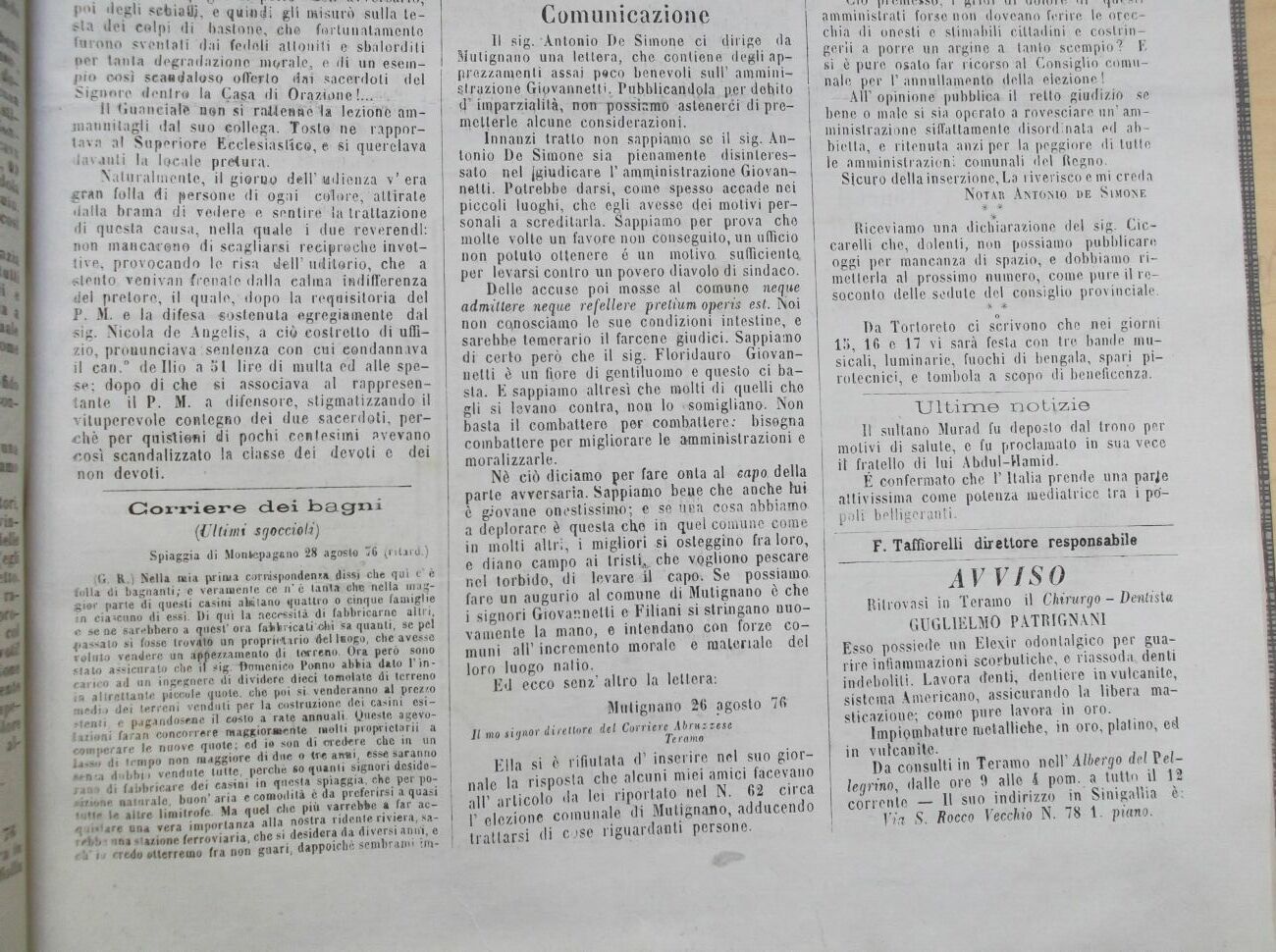 * Riceviamo una dichiarazione del sig. Ciccatili che, dolenti, non possiamo pubblicare oggi per mancanza di spazio, e dobbiamo rimetterla al prossimo numero, come pure il resoconto. delle sedule del consiglio provinciale. # # o Da Tortoreto ci scrivono che nei giorni 15, 16 e 17 vi sar(à festa con tre bande musicali, luminarie, fuochi di bengala, spari pirotecnici, e tombola a scopo di beneficenza. Ultime notizie Il sultano Muraci fu deposto dal Irono per molivi di salute, e fu proclamalo in sua vece il fratello di lui Abdul-Hamid. E confermato che P Italia prende una parje attivissima come potenza mediatrice tra i pó-, poli belligeranti. F. Taffiorelli direttore responsabile AVVISO Ritrovasi in Teramo il Chirurgo - Dentisla GUGLIELMO PATRIGNANI Esso possiede un Elexir odontalgico per guarire infiammazioni scorbutiche, e riassoda denti indeboliti. Lavora denti, dentiere in vulcanite, sistema Americano, assicurando la libera masticazione; come pure lavora in oro. Impiombature metalliche, in oro, platino, ed in vulcanite. Da consulti in Teramo noli1 Albergo del Vel-legrino, dalle ore 9 alle 4 pom. a tutto il 12 corrente Il suo indirizzo in Sinigallia è ,,ft S. Rocco Vecchio N. 78 1. piano. |