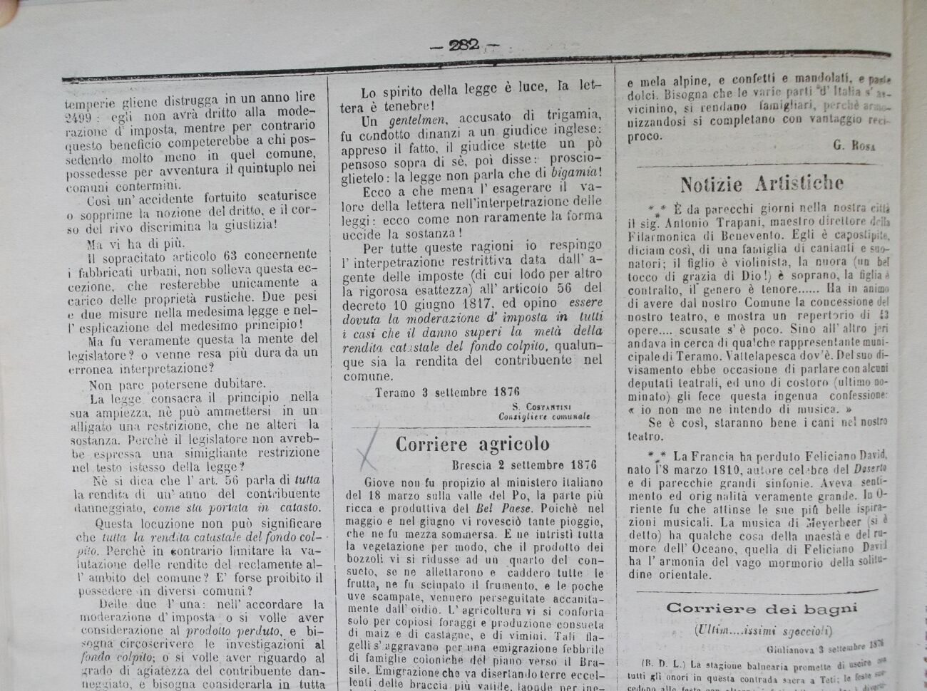 È da parecchi giorni nella nostra città il sig. Antonio Trapani, maestro direttore ddfo Filarmonica di Benevento. Egli è capostipite, diciam così, di una famiglia di cantanti e suonatori; il figlio è violinista, la nuora (un bel tocco di grazia di Dio!) è soprano, la figliai