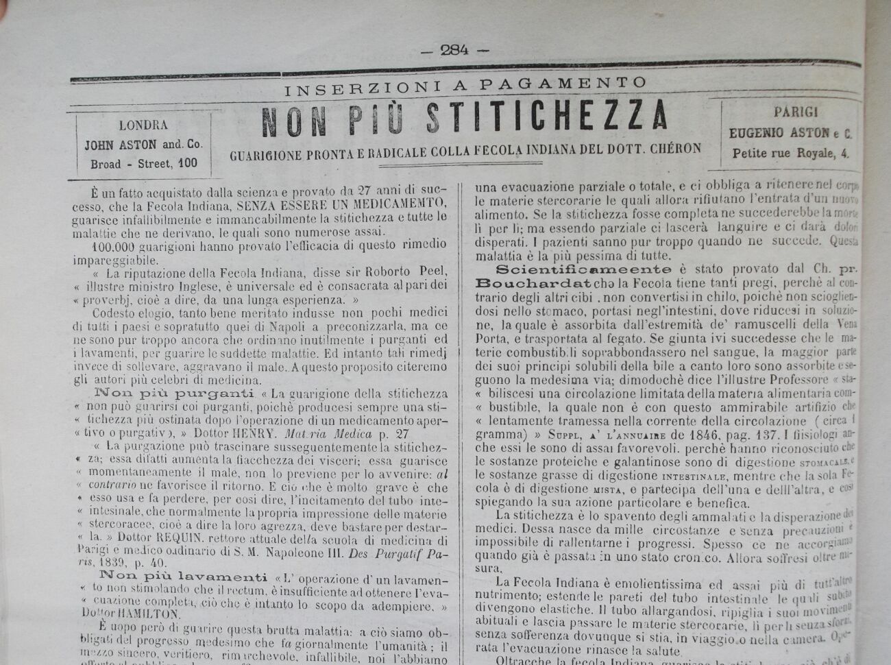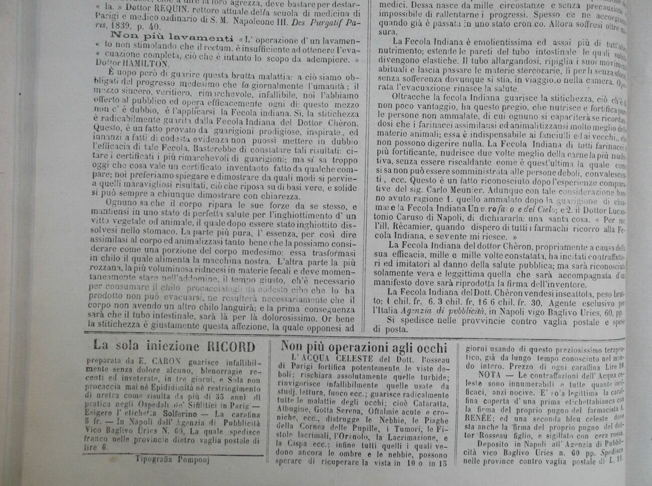 E un fatto acquistato dalla scienza e provato da 27 anni di successo, che la Fecola Indiana, SENZA ESSERE UN MEDICAMEMTO, guarisce infallibilmente e immancabilmente la stitichezza e tutte le malattie che ne derivano, le quali sono numerose assai.
