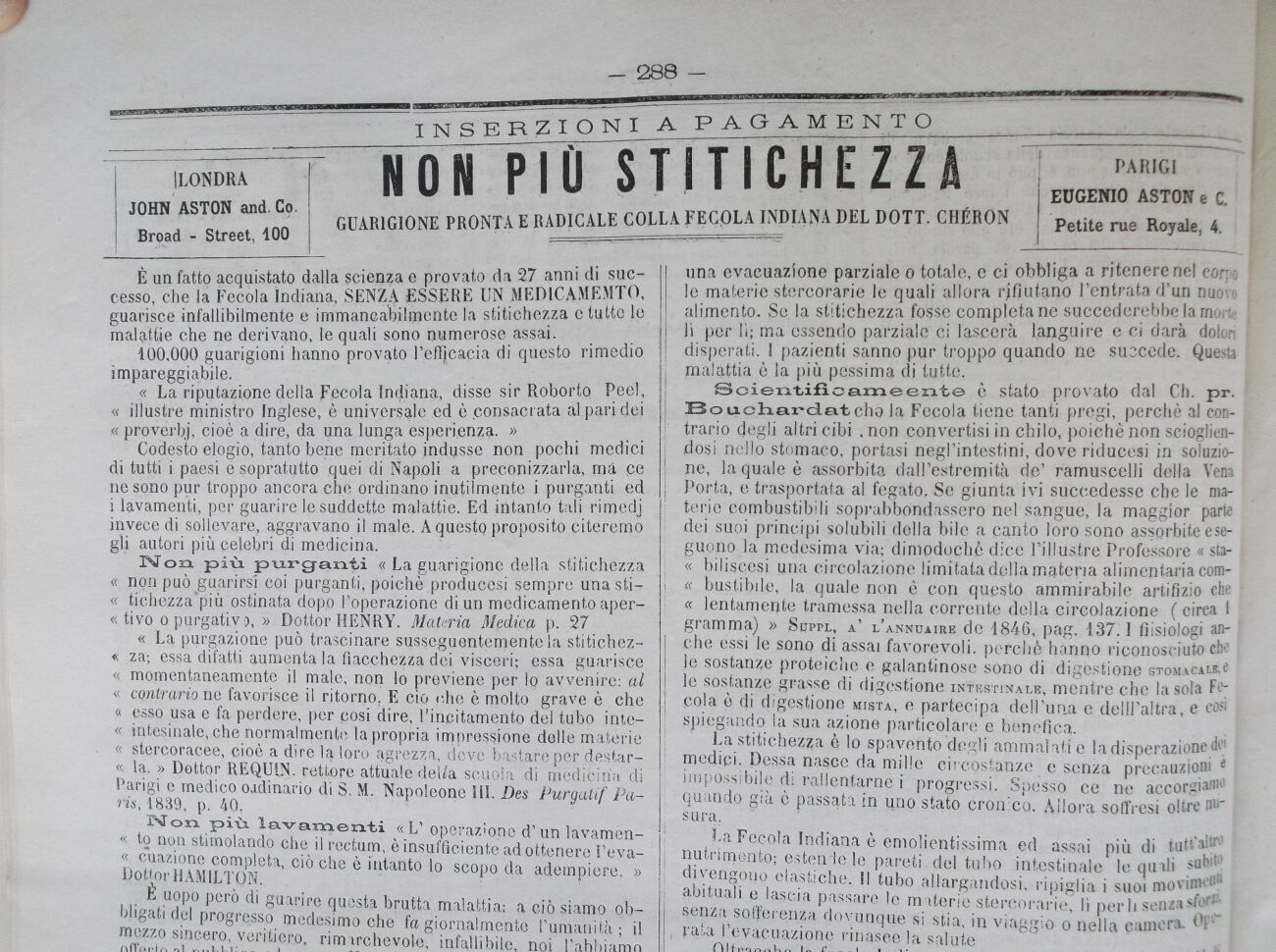 E uopo però di guarire questa brutta malattia; a ciò siamo obbligati del progresso medesimo che fa giornalmente rimanimi il mezzo sincero, veritiero, rimarchevole, infallibile, noi l'abbiamo offerto al pubblico ed opera efficacemente ogni di: questo mezzo non e' è dubbio, è l'applicarsi la Fecola indiana. Sì, la stitichezza è radicabilmente guarita dalla, Fecqla Iqdiana del Dottor Chèron. Questo, è un fatilo provato da guarigioni prodigiose, inspirate., ed innanzi a fatti di codesta evidenza non puossì rpettere in dubbio l'efficacia di taie Fecola. Basterebbe di constatare tali risultati: citare i certificati i più rimarchevoli di guarigioni; ma si sa troppo oggi che cosa vale un certificato inventaoto fatto da qualche ponr,-pare; noi preferiamo spiegare e dimostrare da quali modi si pervie-a quelli maravigliasi risultati, cièche riposa su di basi vere, è solide si può sempre a chiunque dimostrare con chiarezza.