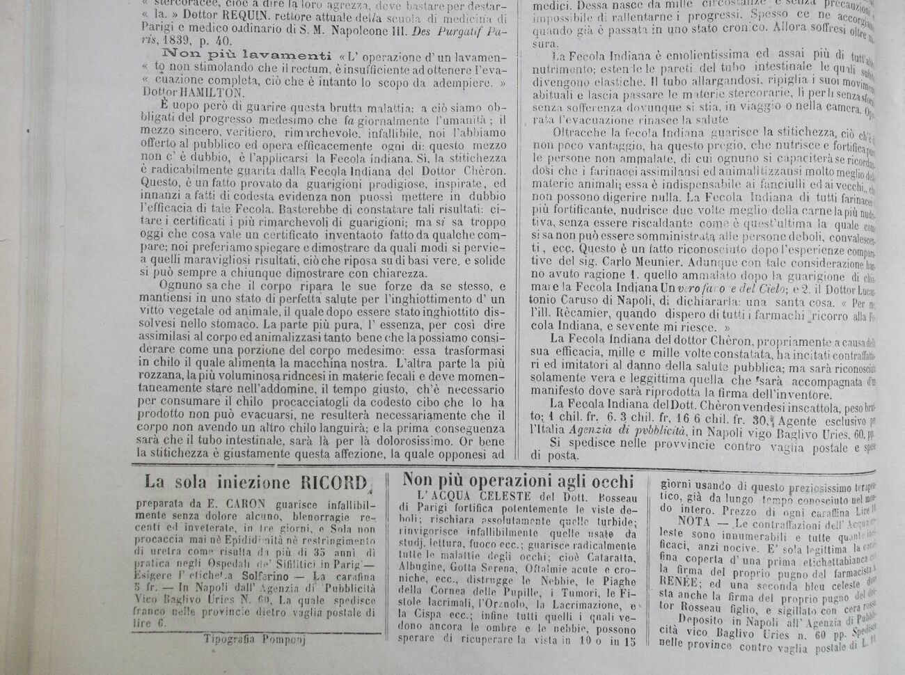 La Fecola Indiana del Dott. Chèron Vendesi inscattola, peso bratto; 4 chil. fr. 6. 3 chil. fr, 16. 6; chil. fr. 30,Agente esclusivo p l'Italia Agenzia di pyb.bjicità, in Napoli vigo Baglivo Uries, 60, pF §i spedisce nelle prowincie contro vaglia postale e spfl di posta