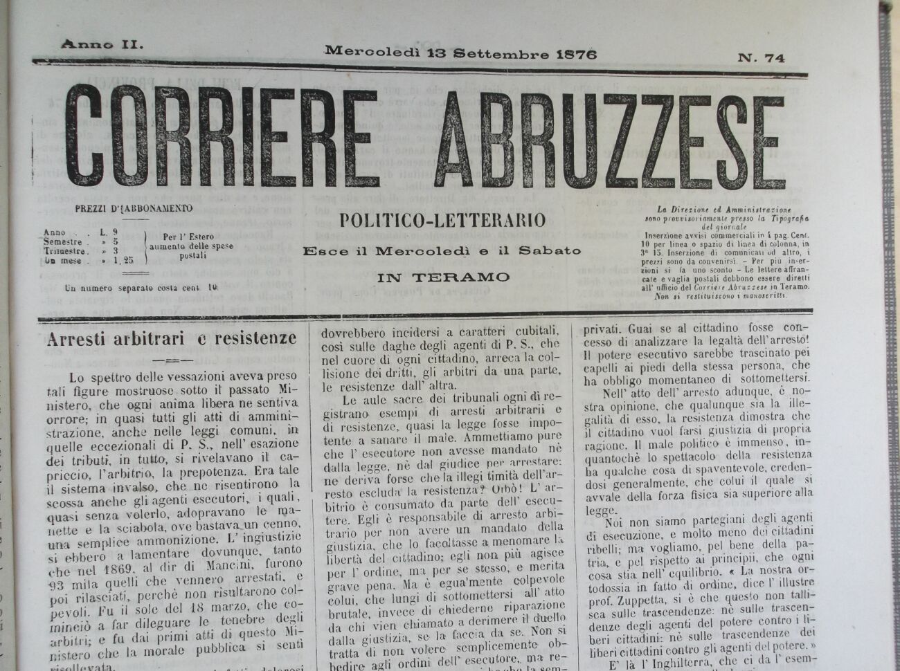 del giornale Inserzione avvisi commerciali in 4 pag. Cent. 10 per linea o spazio di linea di colonna, in 3* 15. Inserzione di comunicati ud altro, i prezzi sono da convenirsi. - Per più inserzioni si fa uno sconto - Le lettere affrancale e vaglia postali debbono essere diretti all' ufficio del Corriere Abruzzese in Teramo.