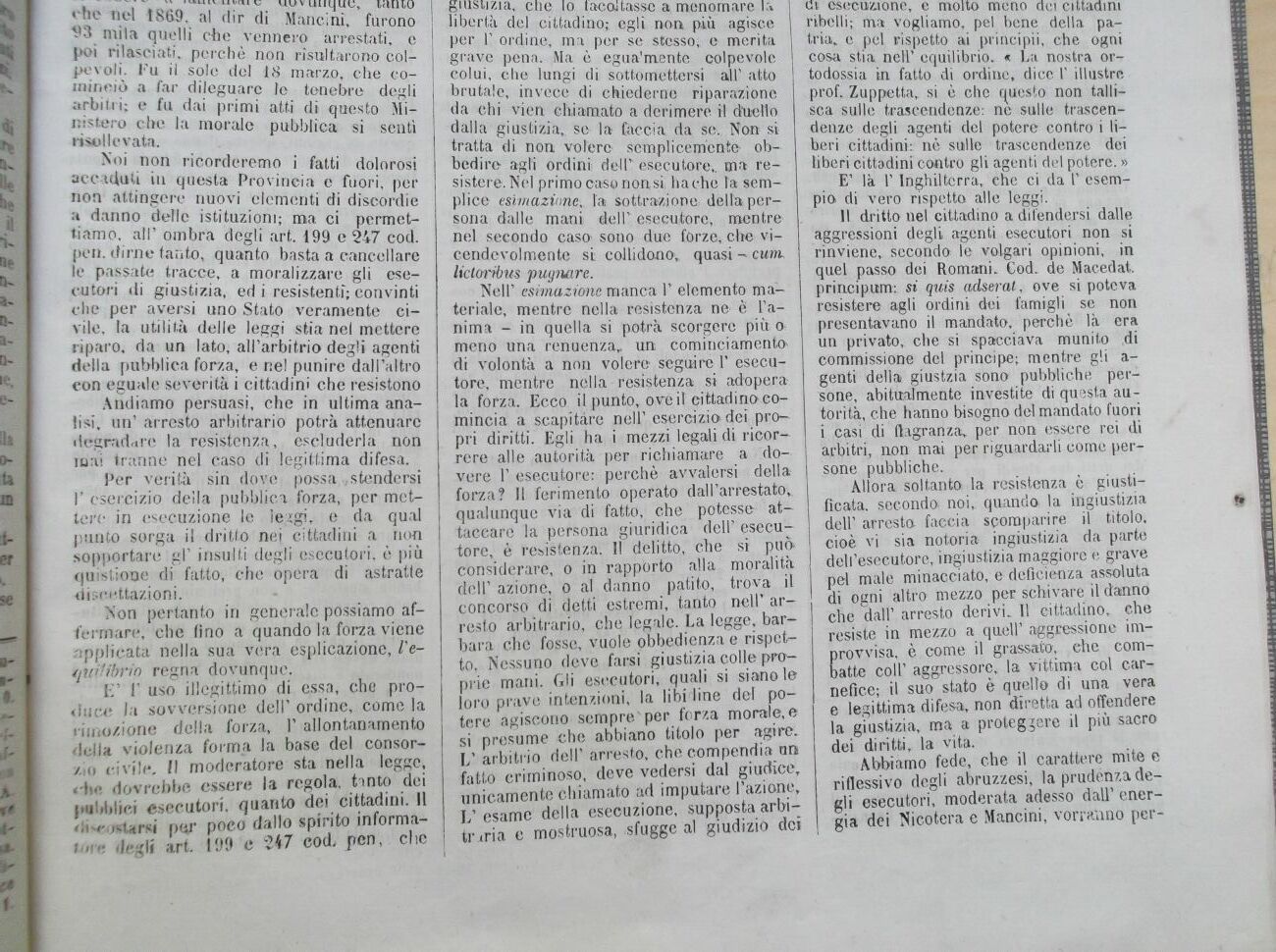 Noi non ricorderemo i fatti dolorosi accaduti in questa Provincia e fuori, per non attingere nuovi elementi di discordie a danno delle istituzioni; ma ci permettiamo, all' ombra degli art. 199 e 247 cod. pen. dirne tanto, quanto basta a cancellare le passate tracce, a moralizzare gli esecutori di giustizia, ed i resistenti; convinti che per aversi uno Stato veramente civile, la utilità delle leggi stia nel mettere riparo, da un lato, all'arbitrio degli agenti della pubblica forza, e nel punire dall'altro con eguale severità i cittadini che resistono Andiamo persuasi, che in ultima analisi, un' arresto arbitrario potrà attenuare degradare la resistenza, escluderla non inai tranne nel caso di legittima difesa.