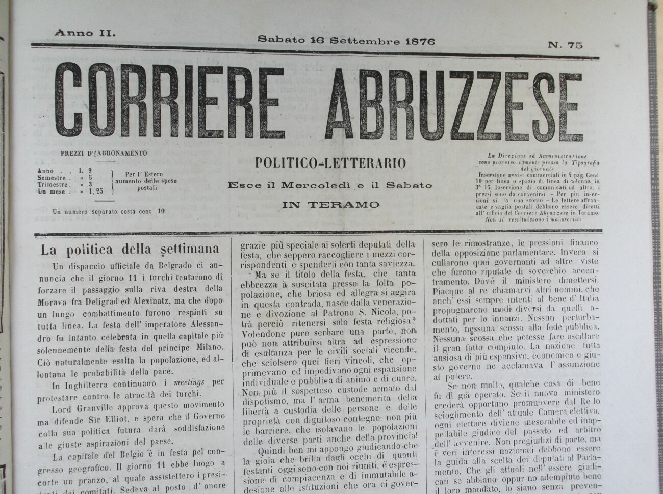 del giornale Fnserzìpqe avvisi commerciali in 1 pag. Ce ai. IO1 per linea o spazio di linea di colonna, in 3* 15. Inserzione di comunicati od altro, i prezzi sono da convenirsi. - Per più in.-er-lioni si 'a uno sconto - Le lettere affrancate e vaglia postali debbono essere diretti all' ufficio del Corriere Abruzzese in Teramo.