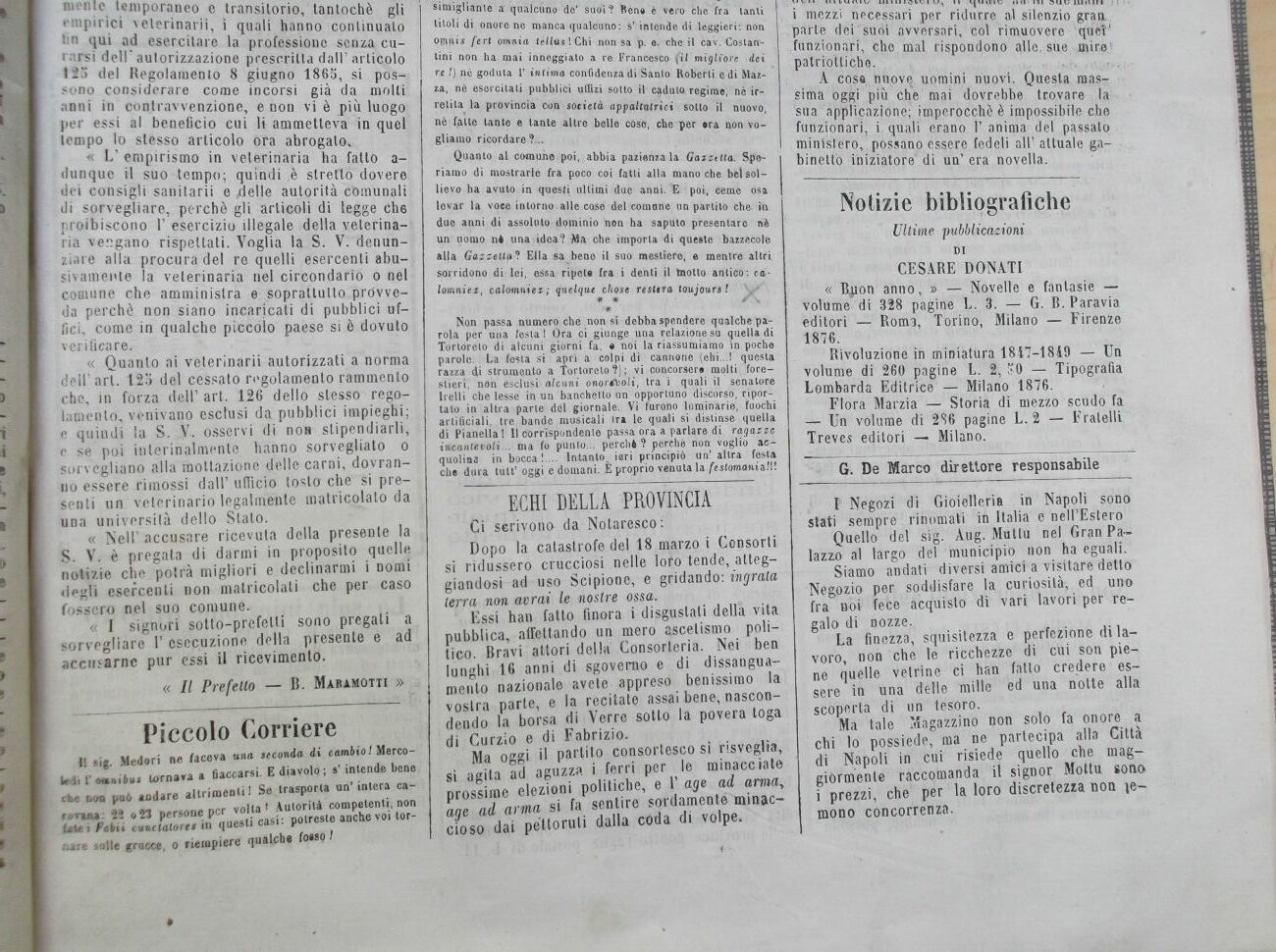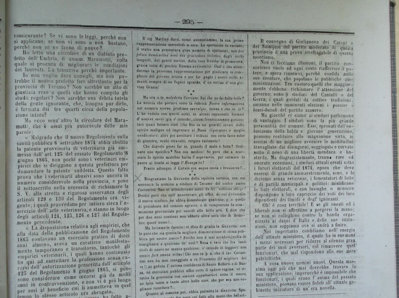 Io non voglio dare consigli, ma non potrebbe il nostro prefetto fare altrettanto per la provincia di Teramo? Non sarebbe un atto df giustizia reso a quelli che hanno compito gli studii regolari? Non sarebbe una debita tutela della gente ignorante, che, bisogna pur dirlo, , formata dai tre quarti circa della popolazione intera?