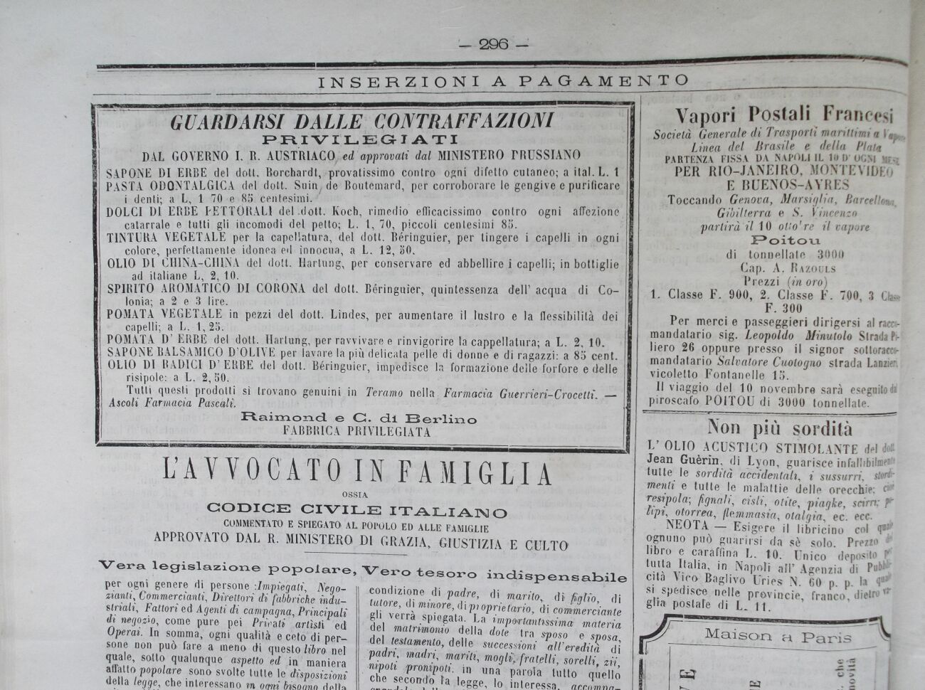 POMATA D' EBBE del dott. Hartung, per ravvivare e rinvigorire la cappellatura; a L. 2, 10. SAPONE BALSAMICO D'OLIVE per lavare la più delicata pelle di donne e di ragazzi: a 85 cent. OLIO DI BADICI D' ERBE del dott. Béringuier, impedisce B formazione delle forfore e delle risìpole; a L. 2,50.