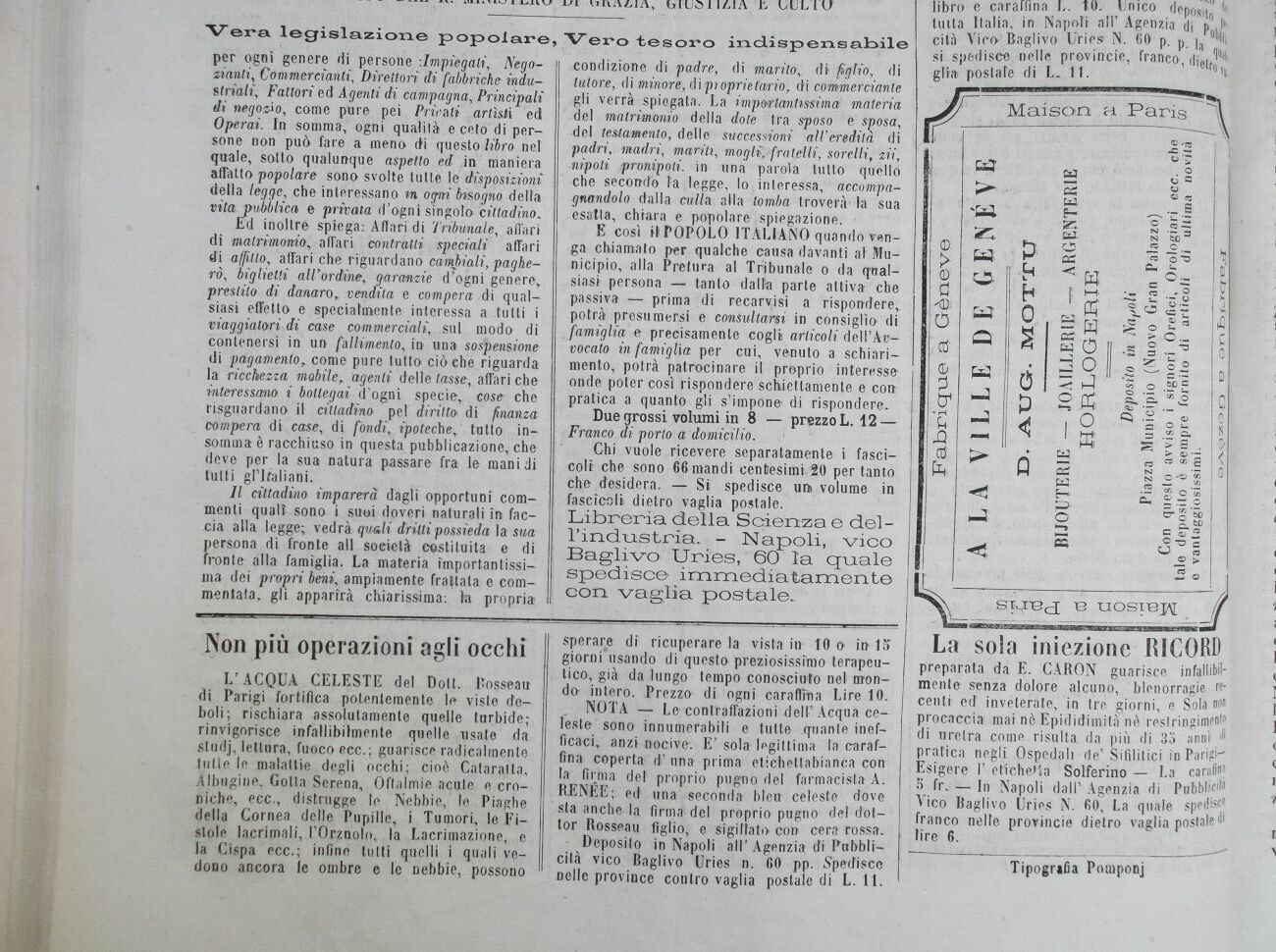 Deposito in Napoli all' Agenzia di Pubblicità vico. Baglivo Uries n. 60 pp. Spedisce nelle province contro vaglia postale di L. 11.