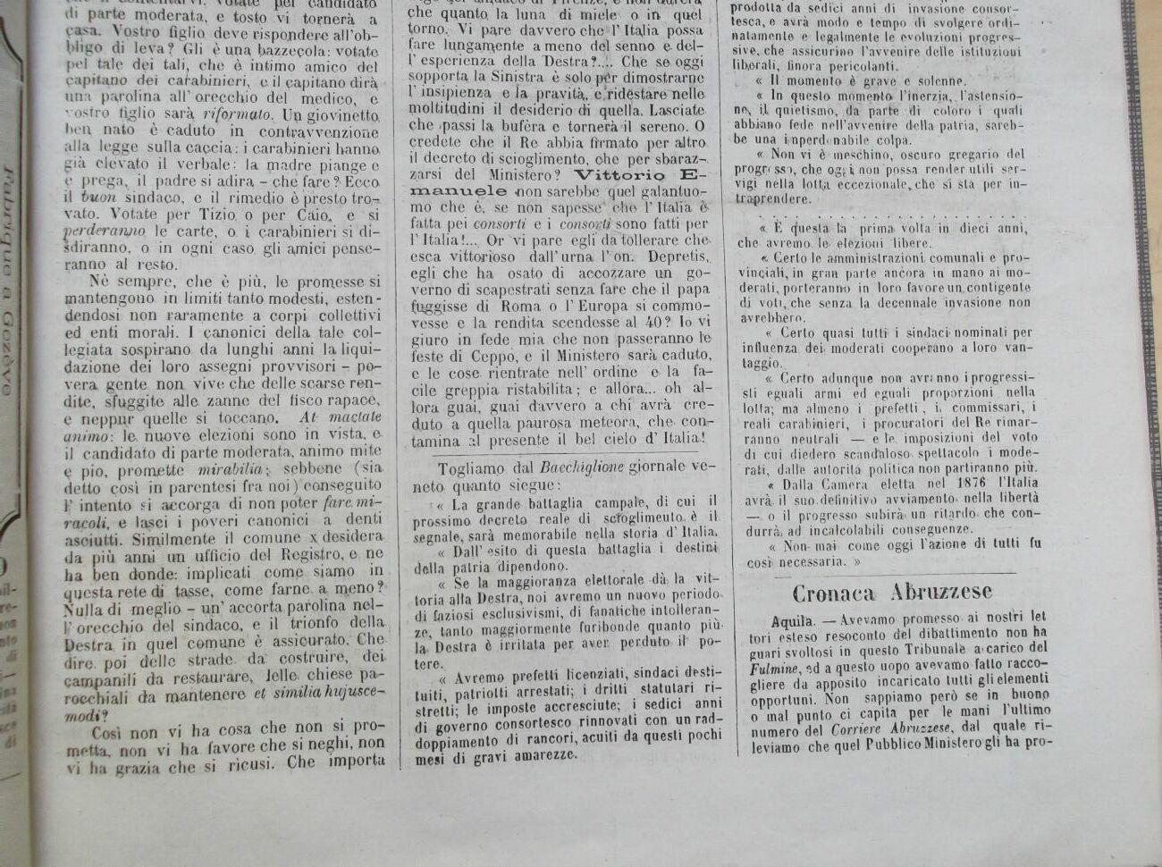 Nè sempre, che è più, le promesse si mantengono in limiti tanto modesti, estendendosi non raramente a corpi collettivi ed enti morali. I canonici della tale collegiata sospirano, da lunghi anni la liquidazione dei loro assegni provvisori - povera gente non vive che delle scarse rendite, sfuggite alle zanne del fisco rapace, e neppjur quelle si toccano. At- mattate animo: la nuove elezioni sono in vista, a il candidato di parte moderata, animo mite e pio, promette mirabilia ^ sebbene (sia detto così in parentesi fra noi /conseguito F intento si accorga di non poter fare.miracoli, e lasci i poveri canonici à denti asciutti. Similmente il comune ^desidera da più anni un ufficio del Registro, e ne ha ben donde: implicati come siamo in questa rete di tasse, come farne, a n^eno ? Nulla di meglio - un'accorta parolina nel-V orecchio del sindaco, e il trionfo della Pestra in quel comune' è assicurato. Che dire poi delle strade, da: costruire, dei campanili da restaurare,, ièlla chiese parrocchi ali da mantenere et similia hnjusce-modi? Così non vi ha cosa che non si premetta, non vi ha favore che si neghi, non vi ha grazia che si ricusi. Che importa I ---10-, ^^uuvu UI I 11 l/Uftl/, V 1»V-W1 1 HUil VI U phe quanto, la luna di mielex o in quél torno. Vi pare davvero che11 F Itajia possa fare lungamente a meno del senno e dell'esperienza della'Destra?..!. Che se oggi sopporta la Sinistra è solo p£r dimostrarne l'insipienza eia pravità, c.rid^staré nelle moltitudini il desiderio di quella. Lasciate che ipassi la bufèra e tornerà !il sereno. 0 credete che il Re abbia firmato per altro il decreto di scioglimento, che per sbaraz^. zarsi del Ministero? "Vittoi»ip E-manu^le non sarebbe quel galantuomo che è, se non sapesse* che l'Italia & fatta pei consorti e i consopì sono fatti per l'Italia!..., Or "vi pare egli'da tollerare cKa esca vittorioso dall'urna lvon. Depretis,. egli che ha osato di accozzare un governo di scapestrati senza fare che il papa (Uggisse di Roma o l'Europa si commovesse e la rendita scendesse al 40 ? Io vi giuro in fede mia che non passeranno la feste di Ceppò, e il Ministero sarà caduto, e le cose, rientrate nell' ordine e la facile greppia ristabilita ; e allóra... oh allora guai, guai davvero a cbi avrà creduto a quella, paurosa meteora, che- eonr-. taurina al presente il bel cielo d'Italia!: Togliamo dal Baechiglimegiornale-ve- i neto quanto siegue: 1 « La grande battaglia campate, di cui il prossimo decreto reale di sofoglimeutou è il; segnale, sarà memorabile nella storia d'Italia. « Dall'esito di questa battaglia i destini della patria dipendono. « Se la maggioranza elettorale dà: la viatoria alla Destra, noi avremo un nuovo periodo-, di faziosi esclusivismi, di fanatiche intolleranze, tanto maggjormpnte furibonde quanto più* la Destra è irritata per aver, perduto il1 potere. i « Avremo prefetti licenziati, sindaci destituiti, patriolti arrestati; i dritti statutari ristretti; le imposte accresciute; i sedici anni di governo consortesco rinnovati con un raddoppiamento di rancori, acuiti da questi pochi mesi di gravi amarezze. prodotta da sedici anni di ipvasione consor-tesca, e avrà modo e tempo di svolgere ordinatamente e legalmente le evoluzioni progressive, che assicurino l'avvenire delle istituzioni litorali, finora pericolanti. « Il momento è grave e solenne. « In questo momento l'inerzia,, l'astensid-ney U quietismo, da parte di coloro i quarti abbiano fede nell'avvenire della patria, sarebbe una iinperdt-nabile colpa. « Non vi è ineschino, oscuro gregario del progre ssi, che Qgfci non possa render utili servigi nélla lottai eccezionale,, che si sta per intraprendere. «. E (fu e sia la prima» volta in dieci anni, che avremo, le-elezioni libere. « Certo le amministrazioni comunali e provinciali, in gran parte ancora in mano ai moderati, porteranno in loro favore un.contigente dj voti,.che senza la decennale invasione non avrebbero. « Certo quasi tuttf i sindaci" nominali per influenza, dei* moderati cooperano a loro vantaggio., « Certo adunque non avrmno i progressisti eguali armi ed eguali proporzioni nella lolla; ma almeno i prefetti, is commissari, i reali carabinieri, i procuratori del Re rimarranno neutrali e Te. imposizioni del voto di cui diedero scandìdoso. spettacolo i moderati, dalle autorità politica non partiranno più. « Dalla Camera eletta nel 1S76 l'Italia avràr il suodefinHivo avviamento' nella libertà » o il progresso subirà* uri ritardò* che condurrà* ad incalcolabili conseguenze. « Non mai come oggi l'azione di tutti fu così» necessaria. » Cronaca Abruzzese Aquila. Avevamo promesso-ai nostri let tori esteso resoconto del dibattimento non ha guari svoltosi in questo Tribunale a |