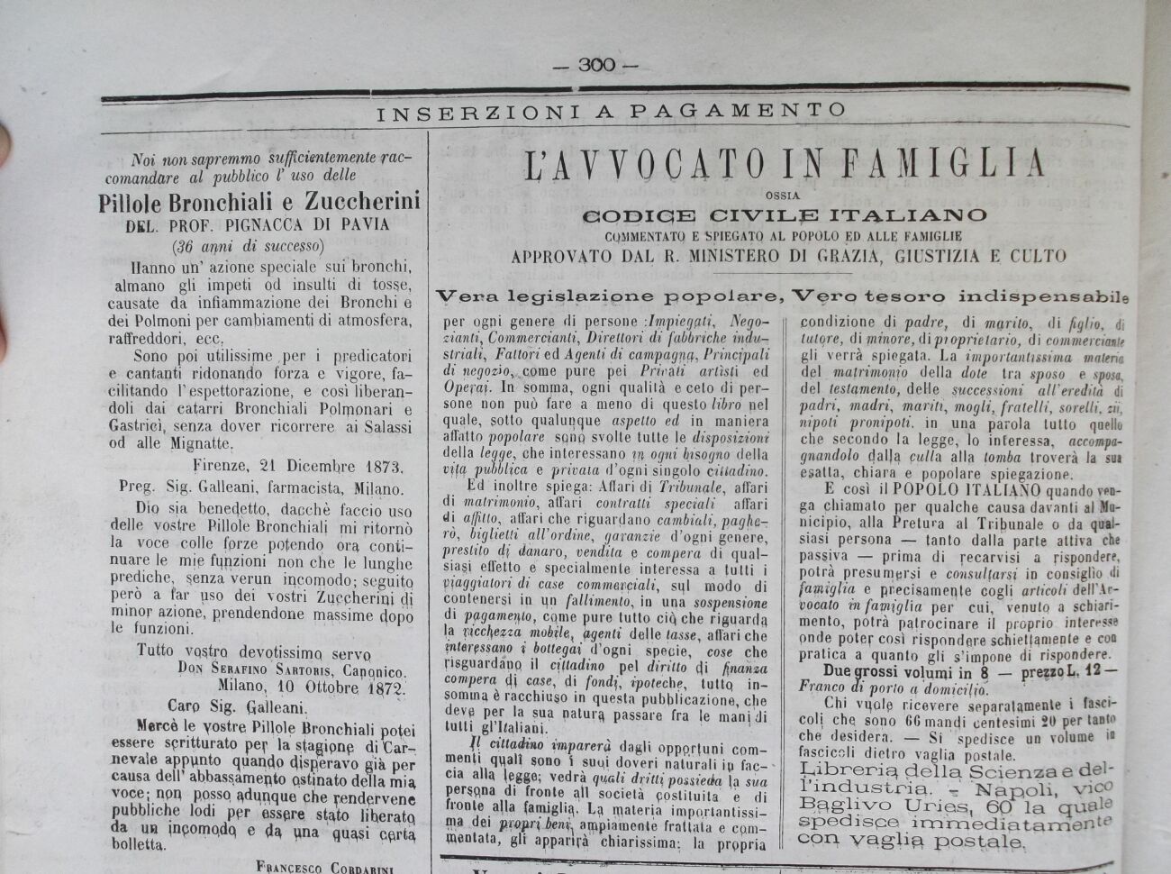 Ed inoltre spiega: Affari di Tribunale, affari di matrimonio, affari contratti speciali affari di affitto, affari che riguardano cambiali, pagherò, biglietti all'ordine, garanzie d'ogni genere, prestito di danaro, vendita, e compera di qualsiasi effetto e specialmente interessa a tutti i Viaggiatori di case commerciali, sql modo di contenersi in qn fallimento, in una sospensione di ppgameqtQ, come pure tutto ci^ che riguarda la ricchezza mobile^ agenti dalle tasse, affari che yntìrtssano i bottegai d'ogni specie, cose che risguardanq il cittadino pel diritto di finanza compera (jj case, di fondi, ipoteche, tuttq insomma è racchiuso in questa pubblicazione, che devp per la sua natur^ passare fra le man\ di tutti gl'Italiani.