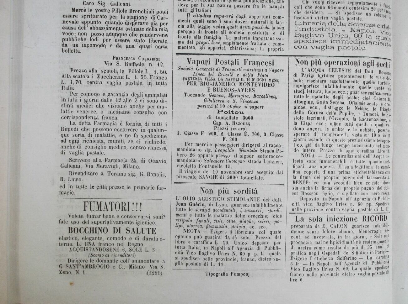 Deposito in Napoli all' Agenzia di Pubblicità vico Baglivo Uries n. 60 pp. Spedisce pelle province contro vaglia postale di L. 11
