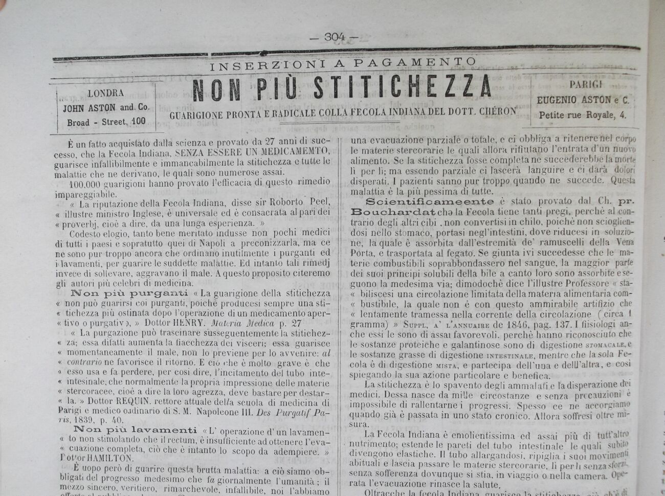 È un fatto acquistato dalia scienza e provato da 27 anni di successo, che la Fecola Indiana, SENZA ESSERE UN MEP1CAMEMT0, guarisce infallibilmente e immancabilmente la stitichezza e tutte le malattie che ne derivano, le quali-sono numerose assai.