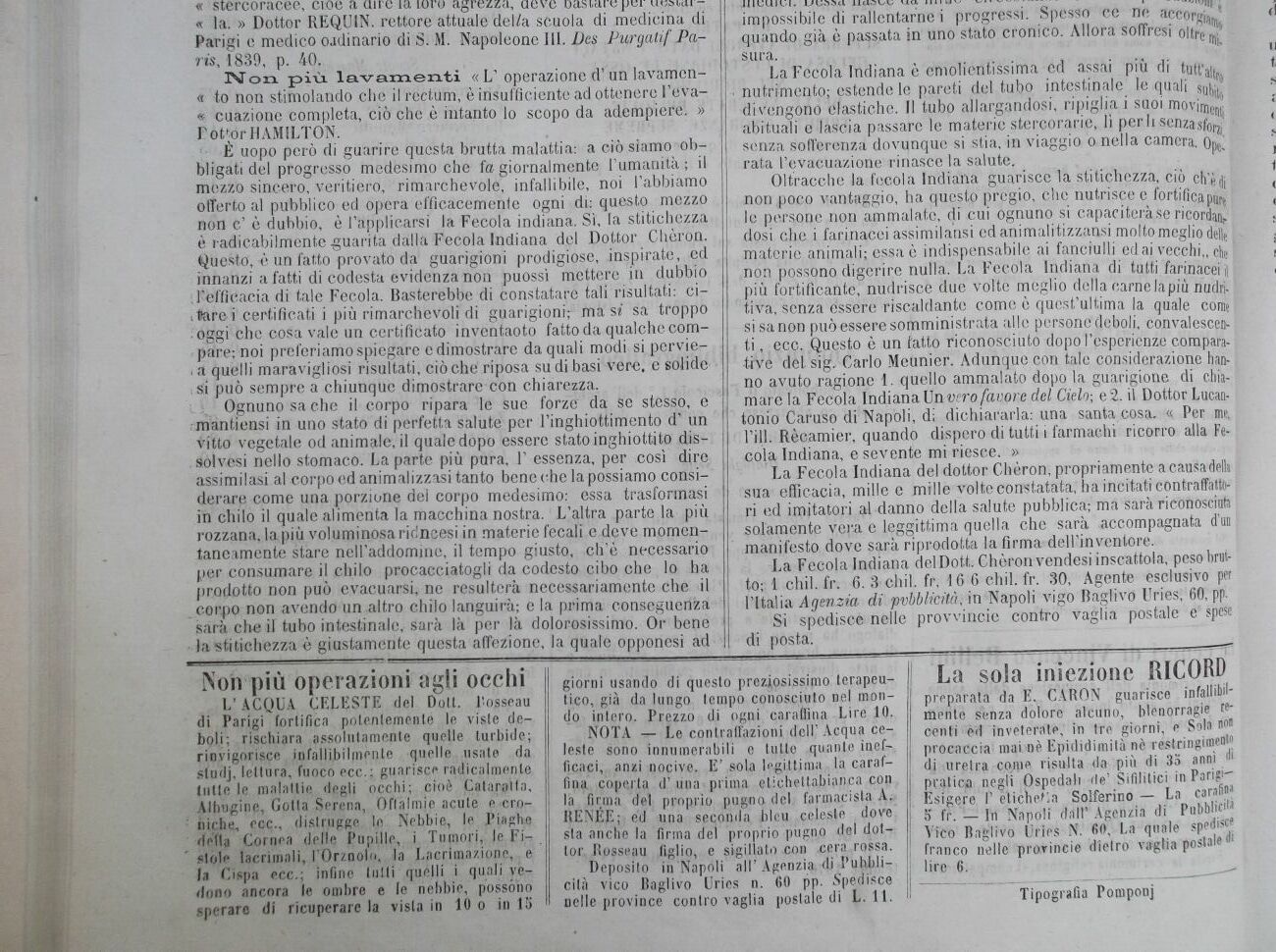 La Fecola Indiana del Dott. Chèron Vendesi inscattola, peso bratto; 1 chil. fr. 6. 3' chil. fr, 16 6 chil. fr. 30, Agente esclusivo per l'Italia Agenzia di pvbblicità, in Napoli vigo Baglivo Uries; 60, pp.