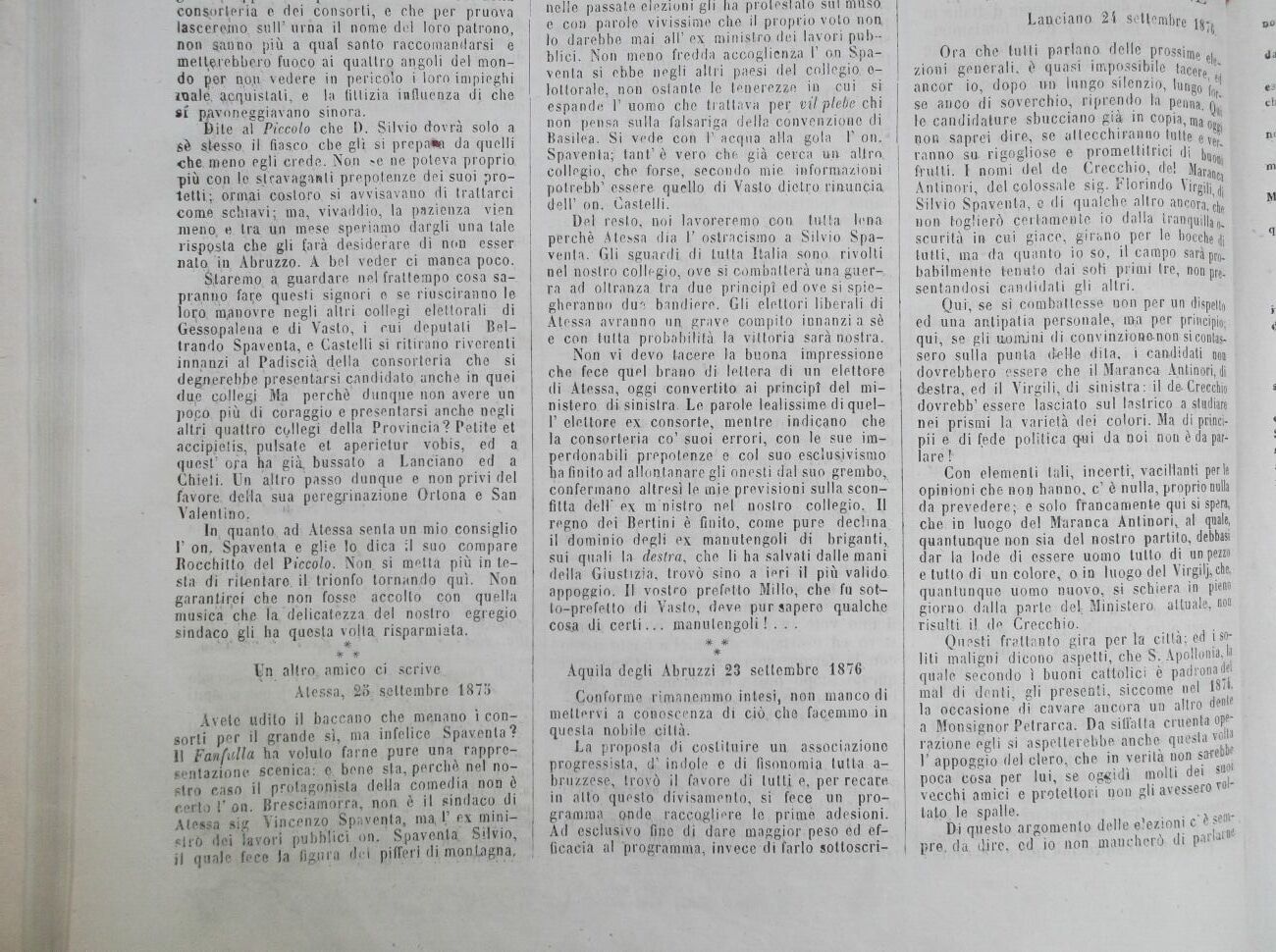 Ora che tulli parlano, delle prossime ,fj zio ni generali, è quasi impossibile tacere, ù ancor io, dopo un lungo silenzio, tango f§, se anco di soverchio, riprendo la penna. Q j le candidature sbucciano già in copia, ma oggj non saprei dire, se attecchiranno tutte e ver, ranno su rigogliose e promeltitrici di buoni fruiti. I nomi del de Crecchio, del Maranca Antinori, del colossale sig. Fbrindo Virgili,di Silvio Spaventa, g di qualche altro ancora,^ non toglierò certamente io dalla tranquillaq^ scurità in cui giace, girano per le bocche di lutti, ma cia quanto io so, il campo sarà prò. labilmente tenuto dai soli primi tre, non pre-sentandosi candidali gli altri. -