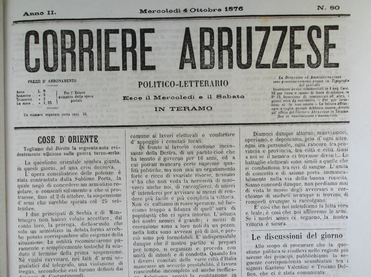 del giornate Inserzione avvici commerciali in I pag. Coni, 10 per linea o spazio di linea di colonna, in $a 15. Inserzione di comunicali od altro, i prezzi sono d.a convenirsi. - Per più inserzioni si fa uno sconto - Le lettere affrancai e e vaglia postali debbono essere>, diretti all' ufficio del Corriere Abruzzese in Teramo.