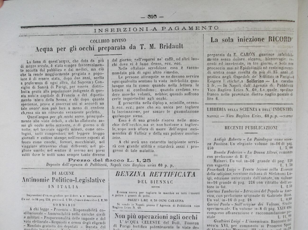 Deposito in Napoli all'Agenzia di Pubblicità vico Baglivo Uries n. 60 pp. Spedisce nelle province contro vaglia postale di L. 11.
