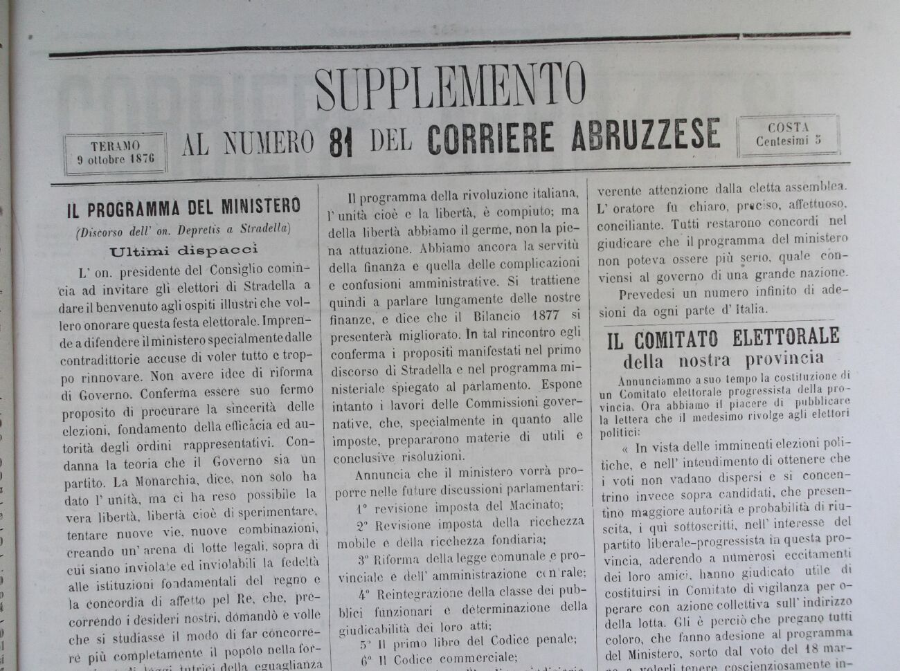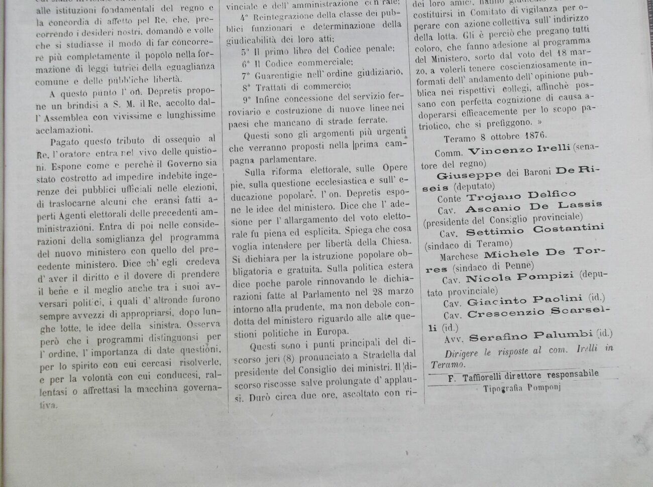 aei loro amie/, naimu costituirsi in Comitato dì vigilanza per o-perarc con azione collettiva sulP indirizzo della lotta. Gli è perciò che pregano tutti Coloro» che fanno adesione al programma del Ministero, sorto dal voto del 18 marzo, a volerli tenere coscienziosamente informati delP andamento dell'opinione pubblica nei rispettivi collegi» affinchè possano con perfetta cognizione dì causa a-doperarsi efficacemente per lo scopo pa-triotico, che si prefiggono» » Teramo 8 ottobre 1876. Comm. "Vincenzo libelli (senatore del regno)