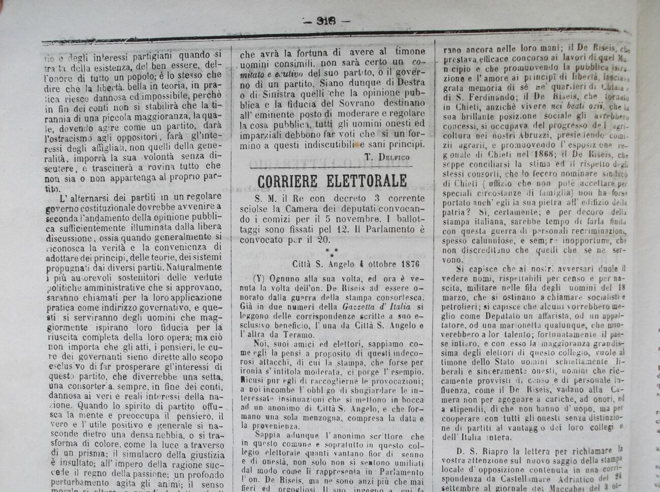 Si capisce che ai noslri avversari duole il vedere nomi, rispettabili per censo e per nascita, militare nelle fila degli uomini del 18 marzo, che si ostinano a chiamare socialisti e petrolieri; si capisce che alcuni vorrebbero meglio come Deputato un affarista, od un appaltatore, od una marionetta qualunque, che muoverebbero a lor talento; fortunatamente il paese intiero, e con esso la maggioranza grandissima degli elettori di questo collegio, vuole al timone dello Stalo uomini schiettamente liberali e sinceramente onesti, uomini che riccamente provvisti di c^nso e di personale influenza, come il De Riseis, vadano alla Camera non per agognare a cariche, ad onori, ed a gtipendii, di èie non hanno d' uopo, ma per cooperare con tutti gli onesti senza distinzione di partiti al vantal o dei loro collegi a dell' Italia intera.