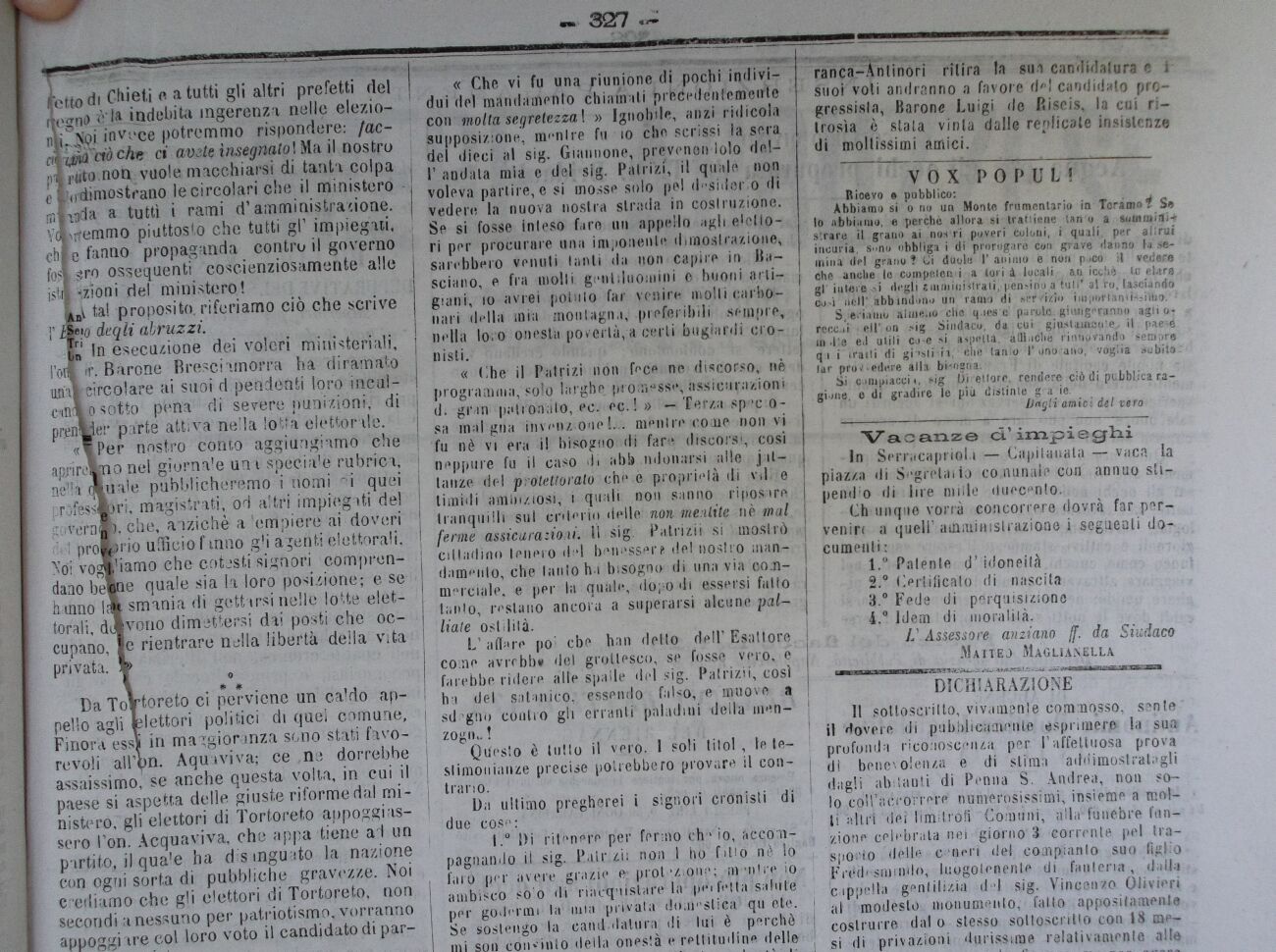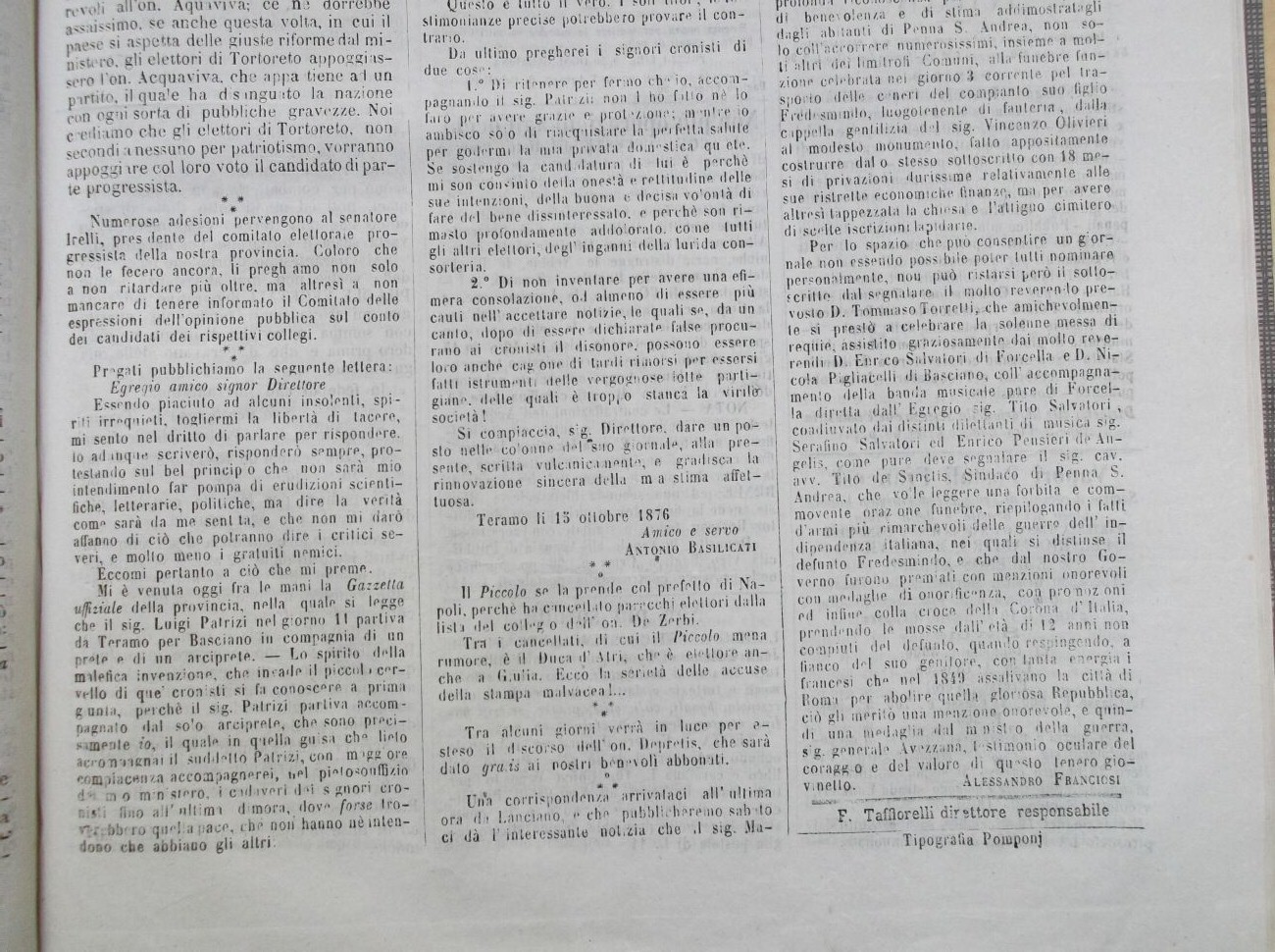 Mi è venula oggi fra le m.ini la Gazzetta ufjiziale della provincia, nella quale si legge che il sig. Luigi Patrizi nel giorno 11 partiva da Teramo per Basciano in compagnia di un prète e di un arciprete. Lo spirito della malefica invenzione, che invade il picco! » cer-vrjlo di que* cronisti si fa conoscere a prima g unta, perchè il sig. Patrizi partiva accompagnalo dal so'o arciprete, che sono preci-s «mente io, il quale in quella guisa che Liéio ae