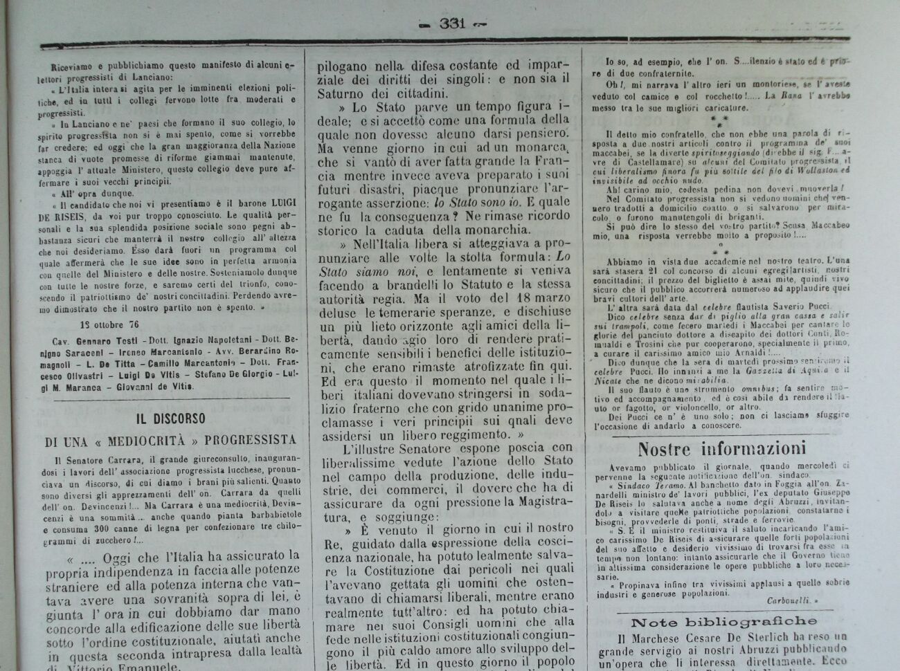 « In Lanciano e ne' paesi cbe formano il suo collegio, lo spirilo progressUla non si è mai spento, come si vorrebbe f*r credere; ed oggi cbe la gran maggioranza della Nazione stanca di vuote promesse di riforme giammai mantenute, appoggia 1' attuale Ministero, questo collegio deve pure affermare i suoi vecchi principii.
