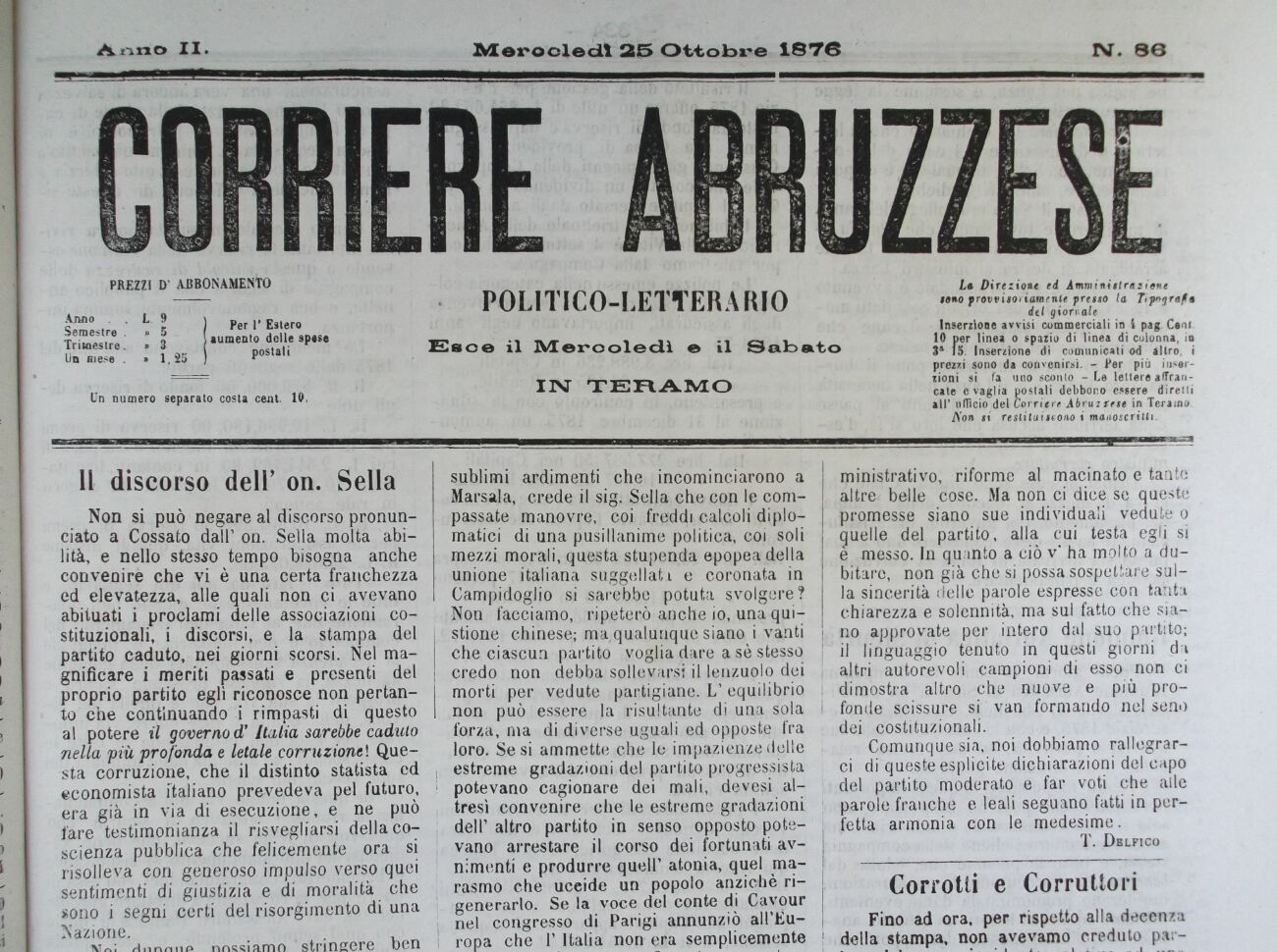 del giornale Inserzione avvisi commerciali in i pag. Ceni 10 per linea o spazio di linea di colonna, in 3a 15. Inserzione di comunicati od altro, i prezzi sono da convenirsi. - Per più inserzioni si fa uno sconto - Le lettere affrancate e vaglia postali debbono essere diretti all' ufficio del Corriere Abruzzese in Teramo.