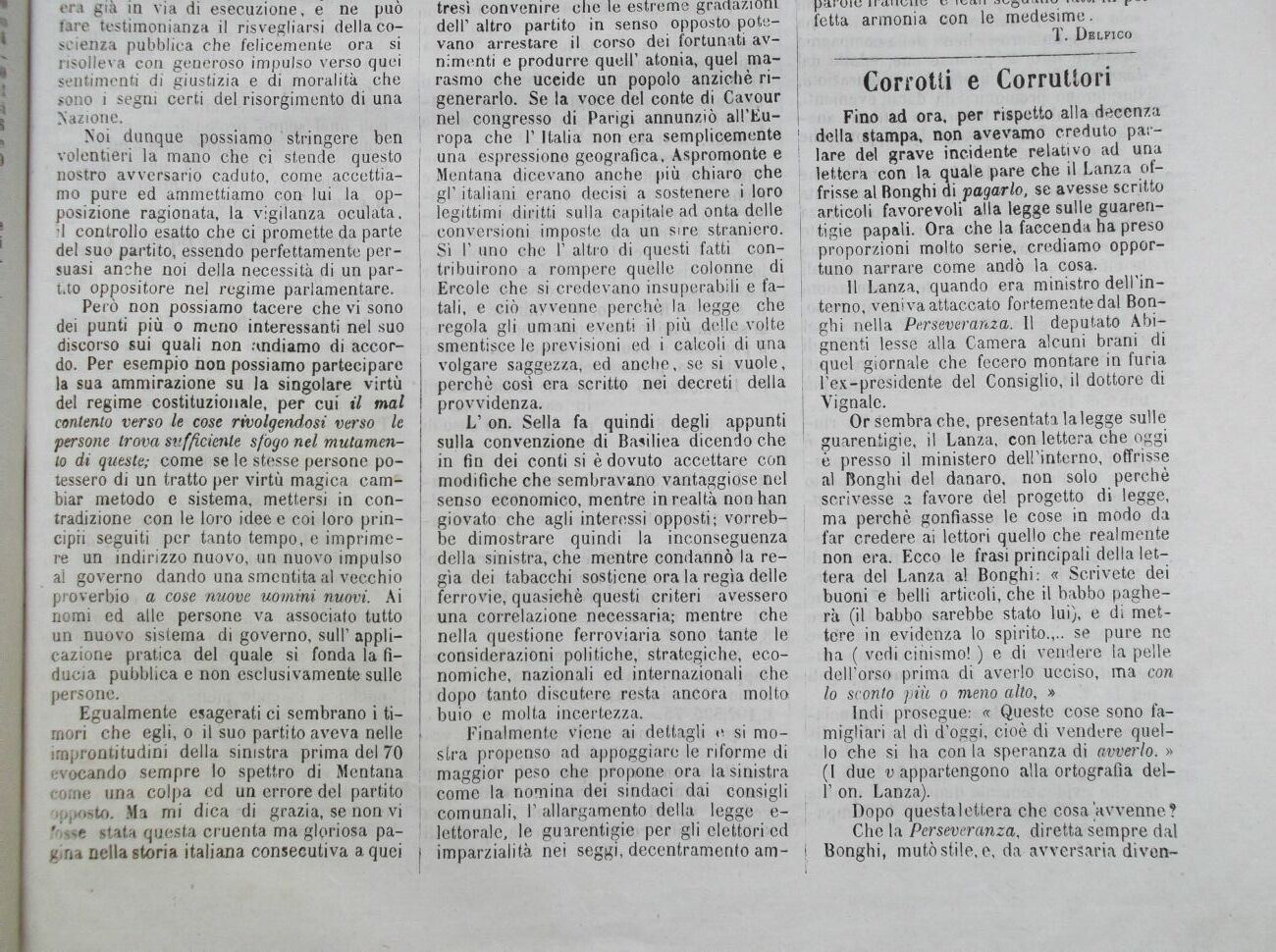 Fino ad ora, per rispetto alla decenza della stampa, non avevamo creduto parlare del grave incidente relativo ad una lettera con la auale pare che il Lanza offrisse al Bonghi ai pagarlo, se avesse scritto articoli favorevoli alla legge sulle guarentigie papali. Ora che la faccenda ha preso proporzioni molto serie, crediamo opportuno narrare come andò la cosa.