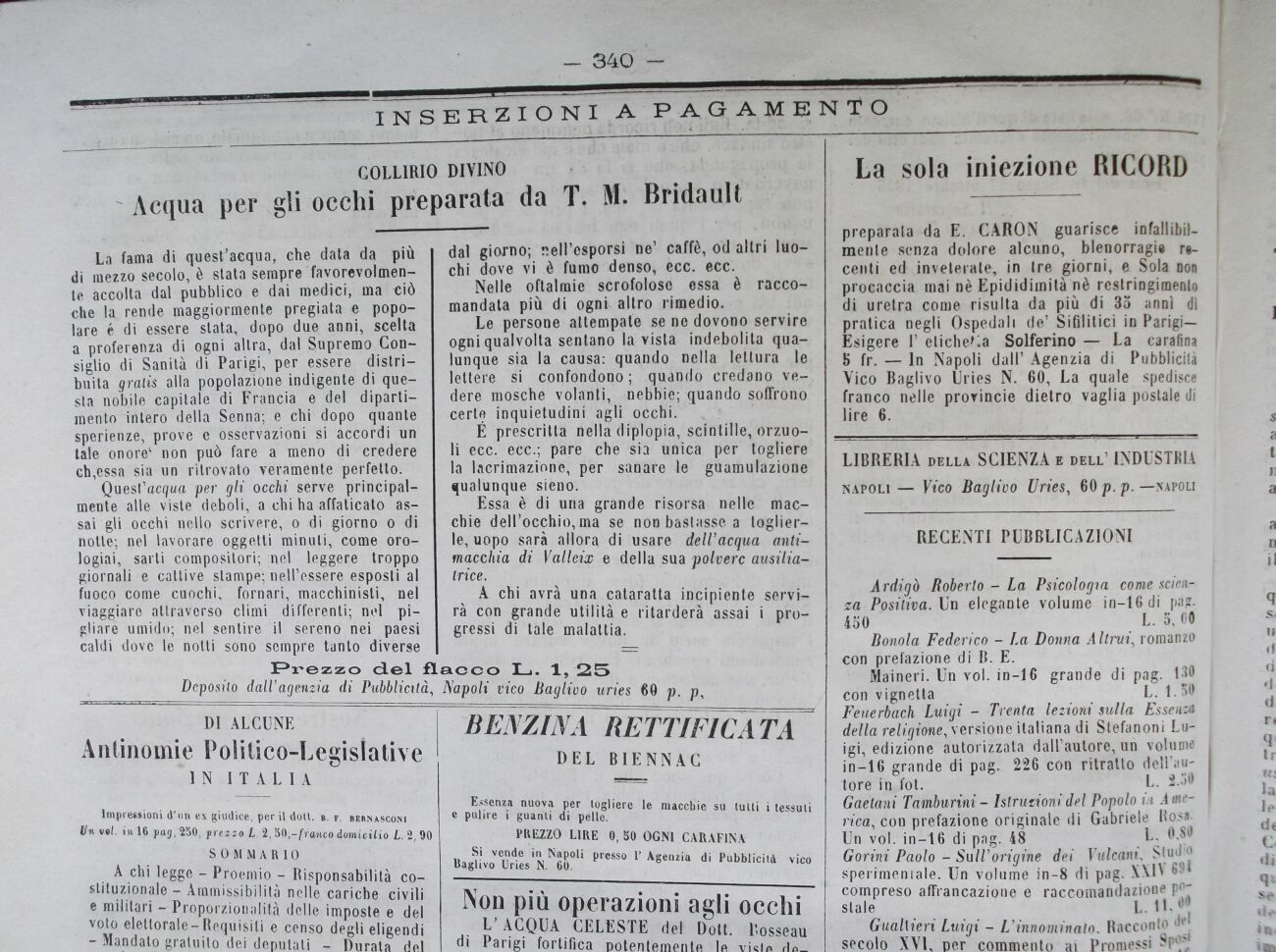 Deposito in Napoli all'Agenzia di Pubblicità vico Baglivo Uries n. 60 pp. Spedisce nelle province contro vaglia postale di L. 11.