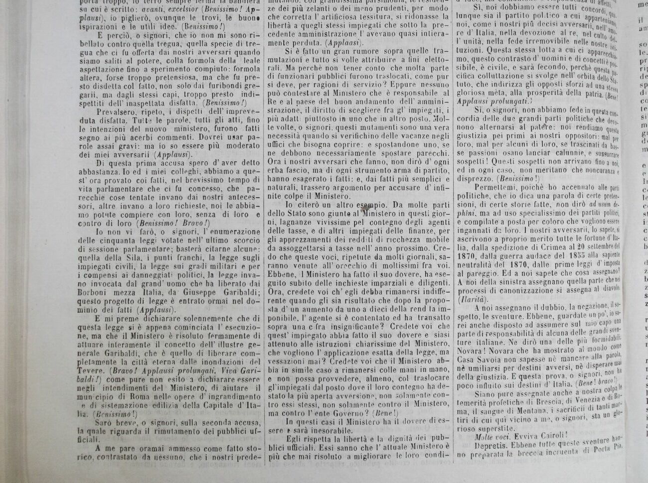 E mi preme dichiarare solennemente che di questa legge si è appena cominciata I' esecuzione, ma che il Ministero è risoluto fermamente di attuare interamente il concetto dell' illustre generale Garibaldi, che è quello di liberare completamente la città eterna dalle inondazioni del Tevere. (Bravo! Applausi prolungali. Viva Garibaldi!) come pure non esito a dichiarare essere negli intendimenti del Ministero, di aiutare il mun;cipio di Roma nelle opere d'ingrandimento e di sistemazione edilizia della Capitale d'Italia. (Bcnissimol)