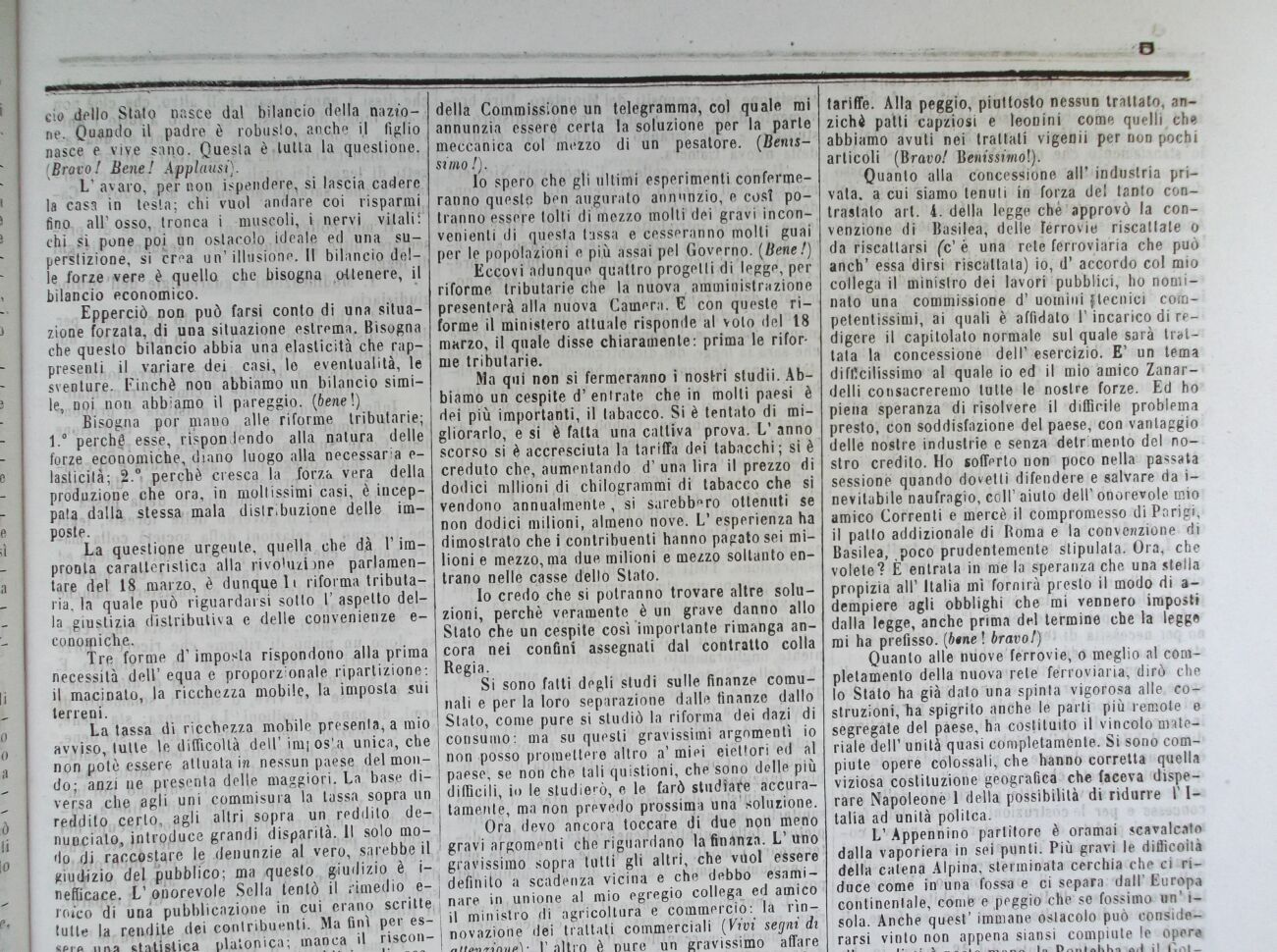 Quanto alle nuove ferrovie, o meglio al completamento della nuova réte ferroviaria, dirò che lo Stato ha già dato una spinta vigorosa alle costruzioni, lia spigrito anche le parti più remote e segregate del paese, ha costituito il vincolo materiale dell' unità quasi completamente. Si sono compiute opere colossali* che hanno corretta quella viziosa costituzione geografica che faceva disperare Napoleone 1 della possibilità di ridurre V I-talia ad unità politca.