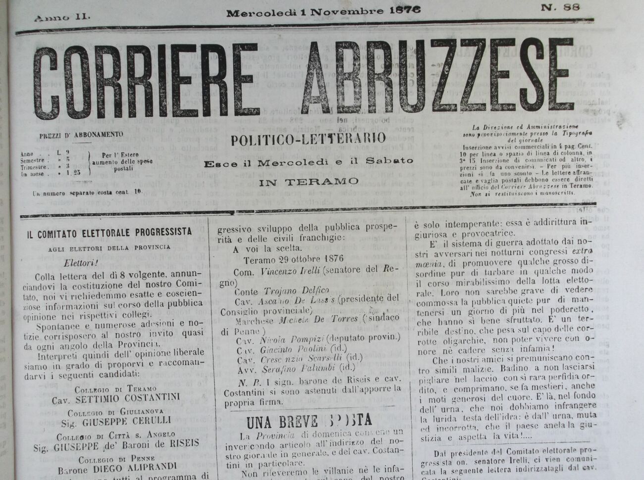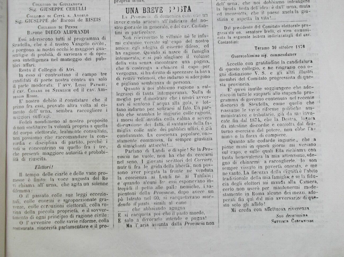 Accetto con gratitudine la candidatura di questo collegio, e ne ringrazio con o-gni distinzione V. S. e gli altri illustri membri del Comitato progressista di questa provincia.