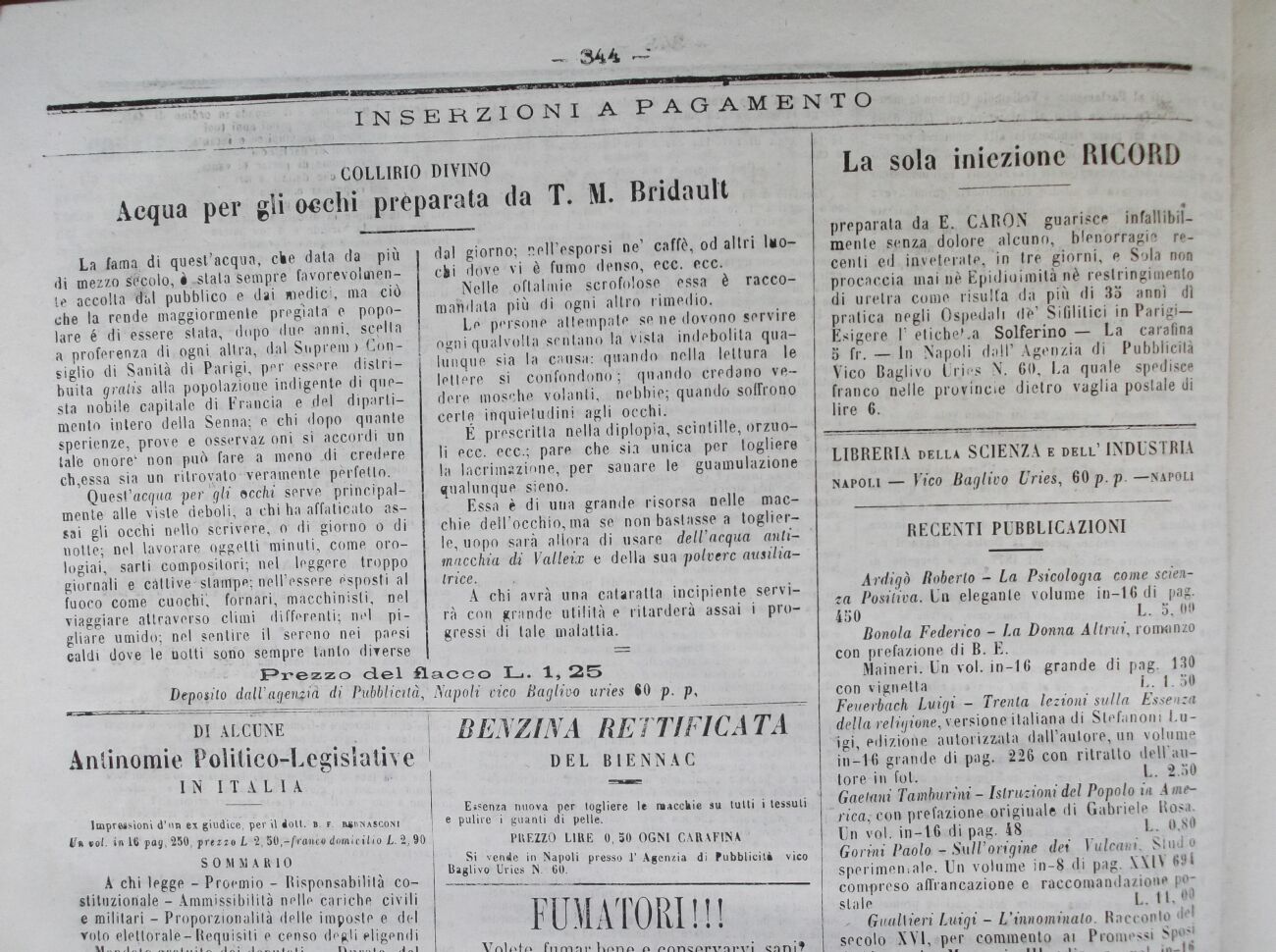 PREZZO LIRE 0,50 OGNI CARAFINA ' ì Si vende in Napoli presso J' Agenzia di Pubblicità vico Baglivo*' Uries N. 60.
