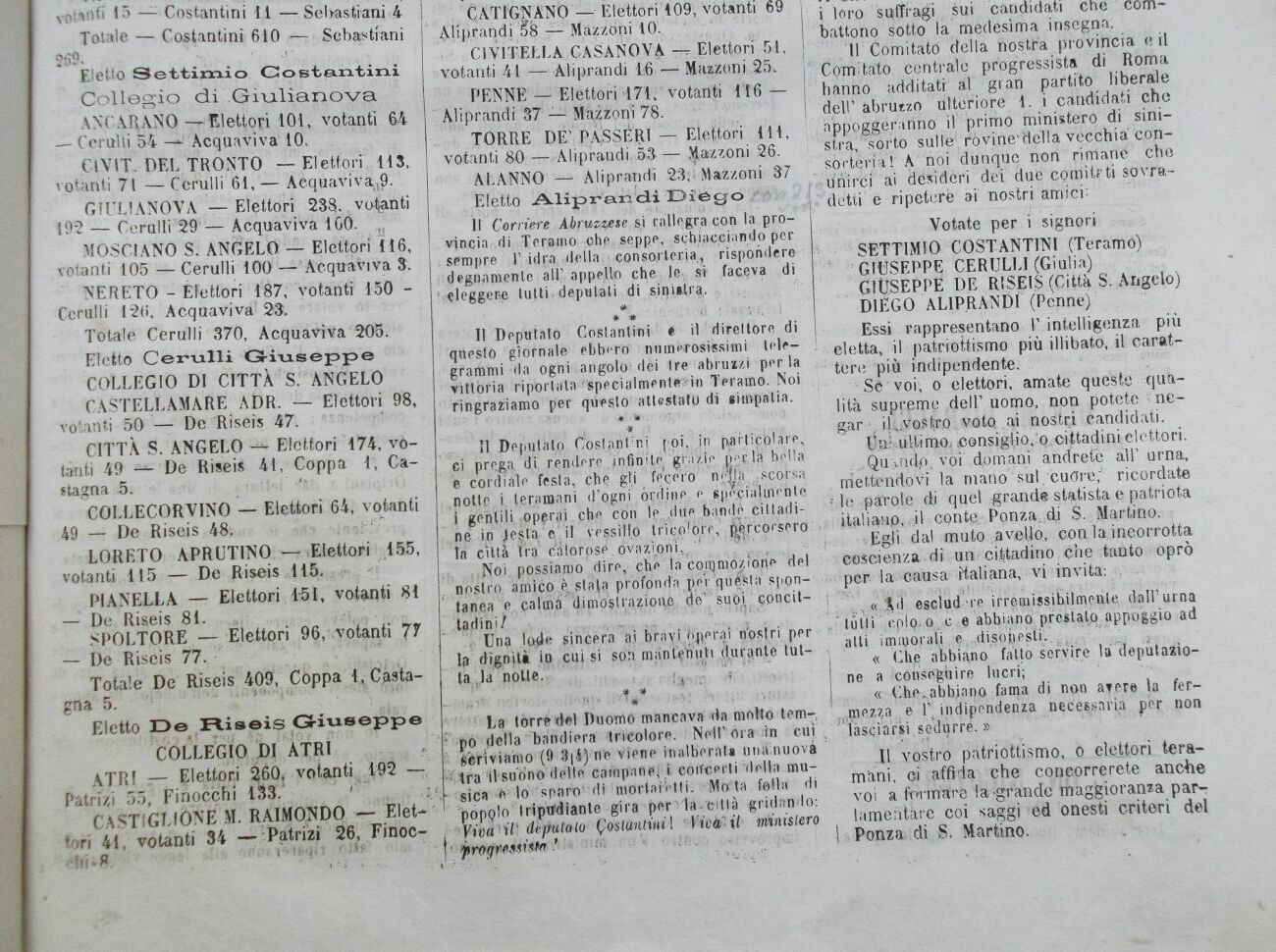 Totale Cerulli 370, Acquaviva 205. Eletto Cerulli Giuseppe COLLEGIO DI CITTÀ S. ANGELO CASTELLAMARE^ ADR. Elettori 98, votanti 50 De Riseis 47.