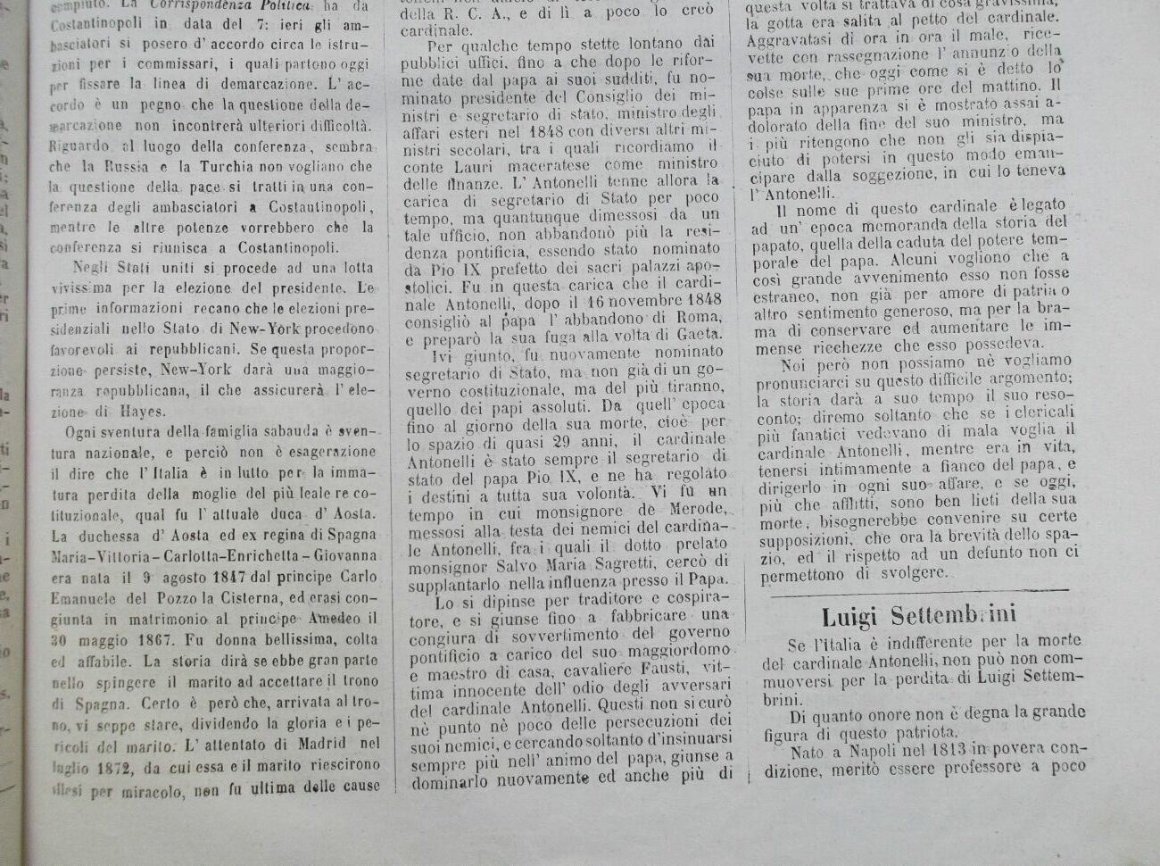 Alle ore 7 1(2 del S corr. nel suo appartamento entro il Vaticano, moriva Giacomo di S. R. C. diacono cardinale An-touelli, dal titolo di S. Agata alla Suburra segretario di stato del pontefice Pio IX.