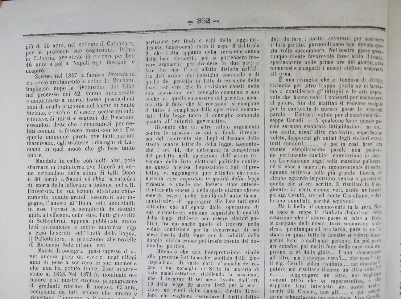 Ma il bello, il commovente fu la sera. Non sì tosto si seppe il risultato definitivo delia votazione che l'intero paese si mise a festa, le campane della nostra torre suonavano a distesa, quantunque ad ora tarda, pure in un' i-stante in quasi tutte le finestre si videro comparire lumi, e moltisime persone. La più parti dei cittadini poi usciti fuor delle case non capivano in sè dalla gioia.... 1' uno domandata all' altro: ma è dunque vero?.... che cosa? che il sig. Cerulli abbia risultato.... ma diamine!^ poteva mò risultare il conte un'altra volta.'.