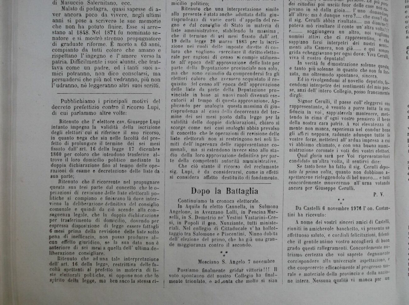 Signor Cerulli, il paese coli' eleggervi suo rappresentante, è venuto a porre tutta la sua fiducia in voi, sappiatevela-mantenere, mettendo in cima d' ogni vostro pensiero il bene della nostra cara patria. A voi elevatezza di mente non manca, esperienza nel condur bene gli affr ri neppure, radunate adunque tutte le vostre forze, mettetevi all' ardua impresa a cui vi abbiamo chiamato, e con una buona amministrazione coronate i voti dei vostri elettori.