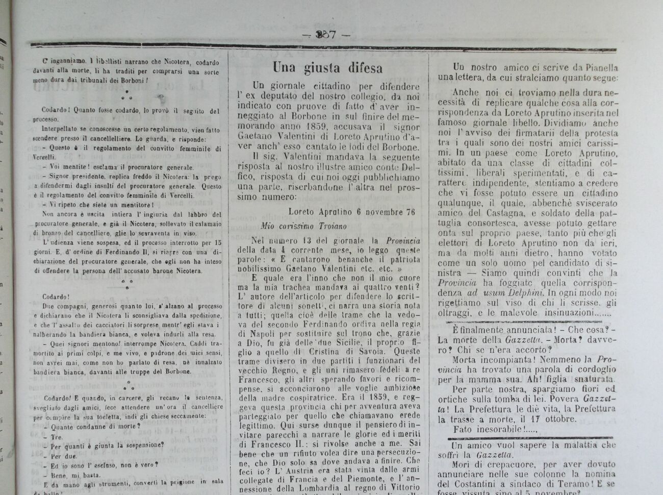 Un giornale cittadino per difendere T ex deputato del nostro collegio, da noi indicato con pruove di fatto d' aver inneggiato al Borbone in sul finire del memorando anno 1859, accusava il signor Gaetano Valentini di Loreto Aprutino d'aver anch' esso cantato le lodi del Borbone.