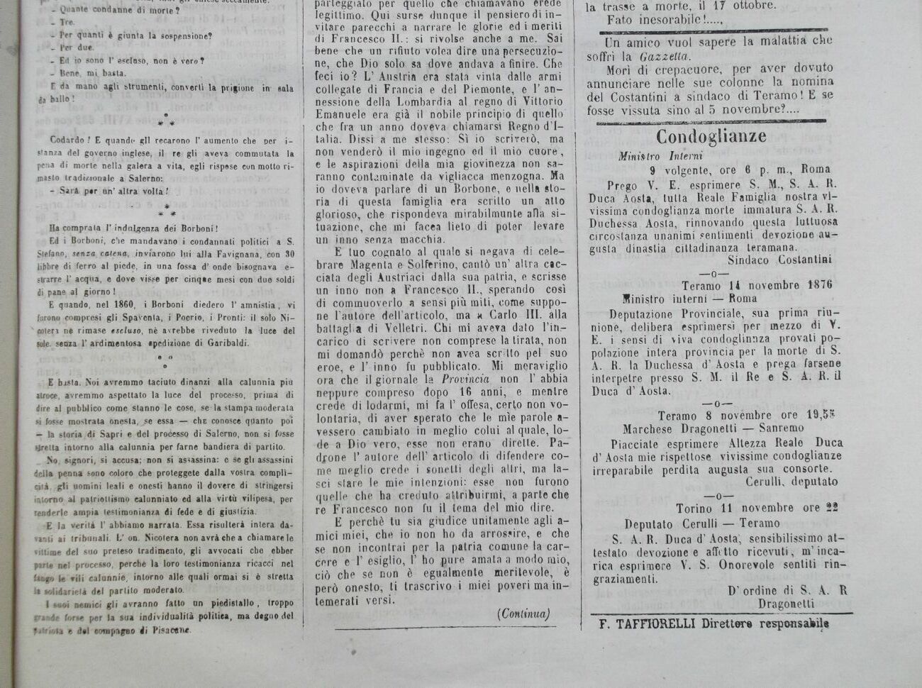 Morì di crepacuore, per aver dovuto annunciare nelle sue colonne la nomina del Costantini a sindaco di Teramo ! E se fosse vissuta sino al 5 novembre?....