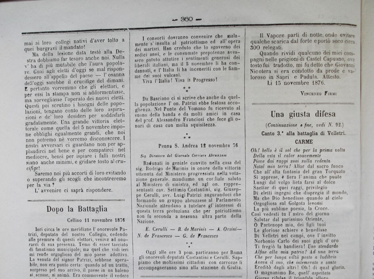 Radunati in geniale convito nella casa del sig. Rodrigo de Marinis in onore della vittoria ottenuta dal Ministero progressista nella votazione generale, mandiamo un cordiale saluto al Ministero di sinistra, ed agi' on. rappresentanti cav. Settimio Costantini, sig. Giuseppe Cerulli, avv. Luigi Patrizi augurandoci che formando un gruppo abruzzese al Parlamento Nazionale attendano a tutelare gì' interessi di questa terra pretuziana che per patriottismo non fu seconda a nessuna altra parte della Nazione.
