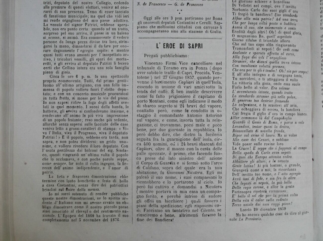Vincenzo Firmi Vice cancelliere nel tribunale di Teramo era in Ponza ( dopo aver subitole trafile di Capri, Procida, Ven-totene ) nel 27 Giugno 1857, quando pervenne il bastimento Cagliari in quell'Isola, essendo in unione di vari amici sotto la tenda del caffè. È ben inutile descrivere come fu fatto prigioniero il capitano di porto Montani, come egli indicasse il modo di sbarco segreto ai 24 bravi del vapore, coattatto però, come fo condotto in o-staggio il comandante Antonio Astorino sul vapore, e come, insorta tutta la relegazione, ci trovammo, poco male e j>oco bene, per due giornate in repubblica. Io però debbo dire, che dietro la fucileria seguita fra la guarnigione dell' isola, circa 400 uomini, ed i 24 bravi sbarcati dal Cagliari oltre il mazzo con la cesta delle palle spezzate, il primo, che facendo fuoco prese dal lato sinistro dell' azione il Corpo di Guardia e si fermò sotto l'arco di Califano, sopra del quale era la mia abitazione, fu Giovanni Nicotera. Egli mi palesò il suo nome, i suoi compaesani lo riconobbero e lo portarono al cielo. Io però fui cattivo e domandai a Nicotera ( mentre portava in mia casa un compagno ferito, e perchè intriso di sudore gli offrii un bicchiere ) quali fossero i piani della spedizione; egli risposemi così: Facciamo un tentativo nel Cilento, se riusciremo e bene, altrimenti faremo la fine dei Bandiera!