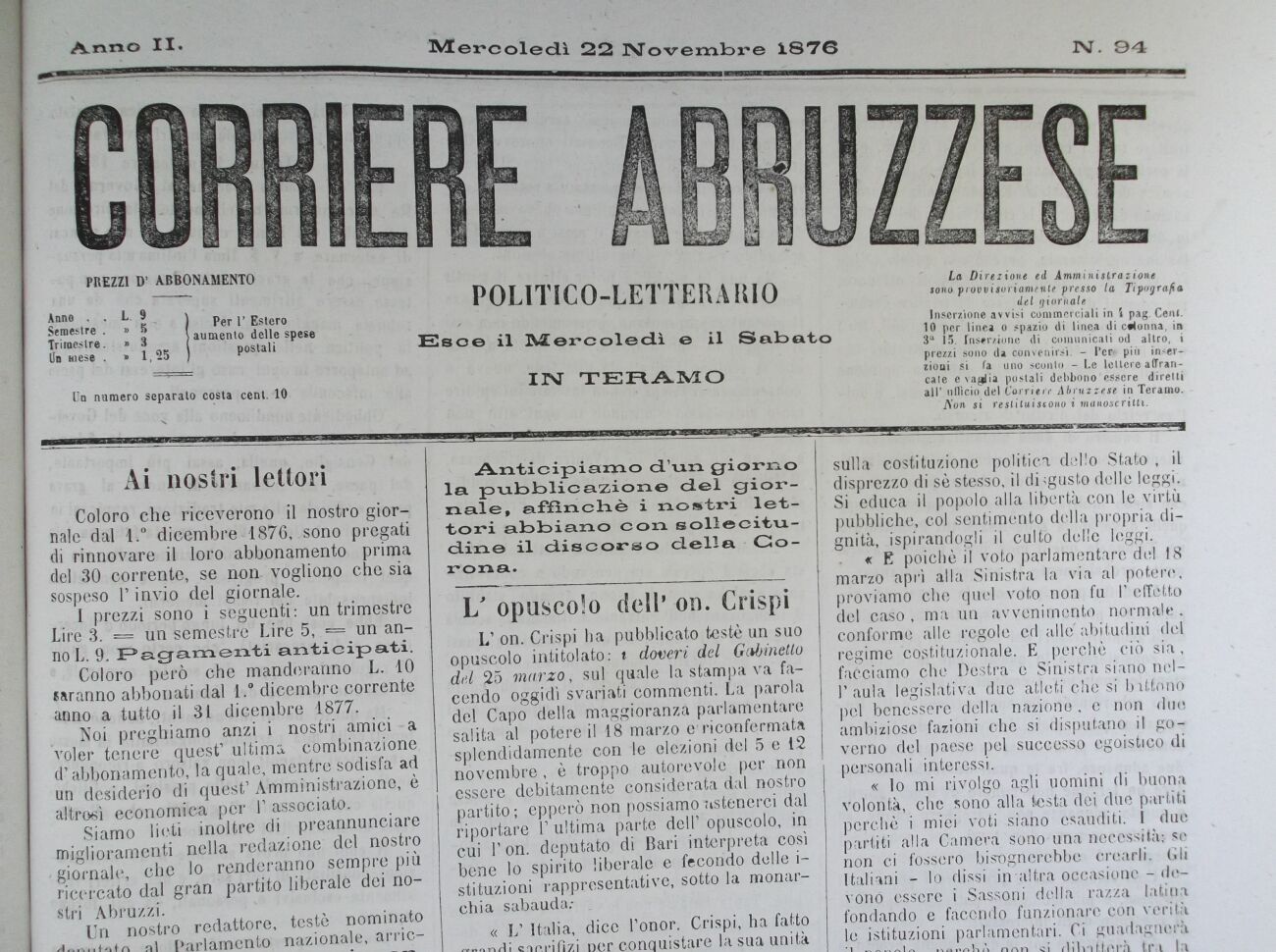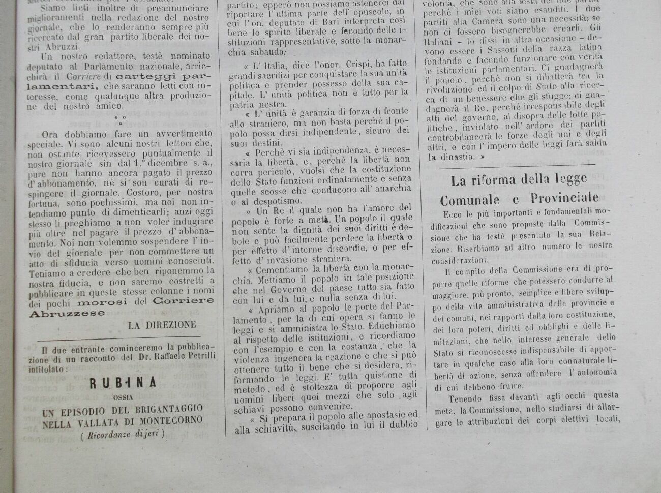 Siamo lieti inoltre di preannunciare miglioramenti nella redazione del nostro giornale, che lo renderanno sempre più ricercato dal gran partito liberale dei nostri Abruzzi.