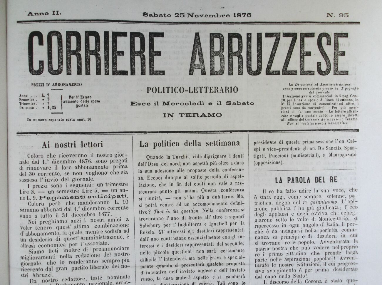 Siamo lieti inoltre dì proannunciare miglioramenti nella redazione del nostro giornale, che lo renderanno sempre più ricercato dal gran partito liberale dei nostri Abruzzi.