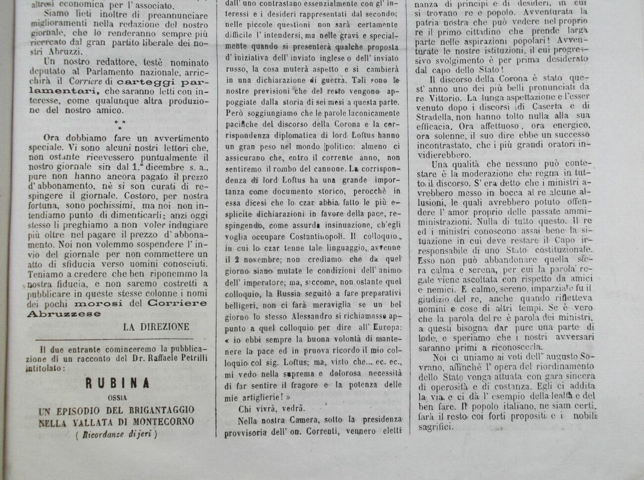 Siamo lieti inoltre dì preannunciare miglioramenti nella redazione del nostro giornale, che lo renderanno sempre più ricercato dal gran partito liberale dei nostri Abruzzi.