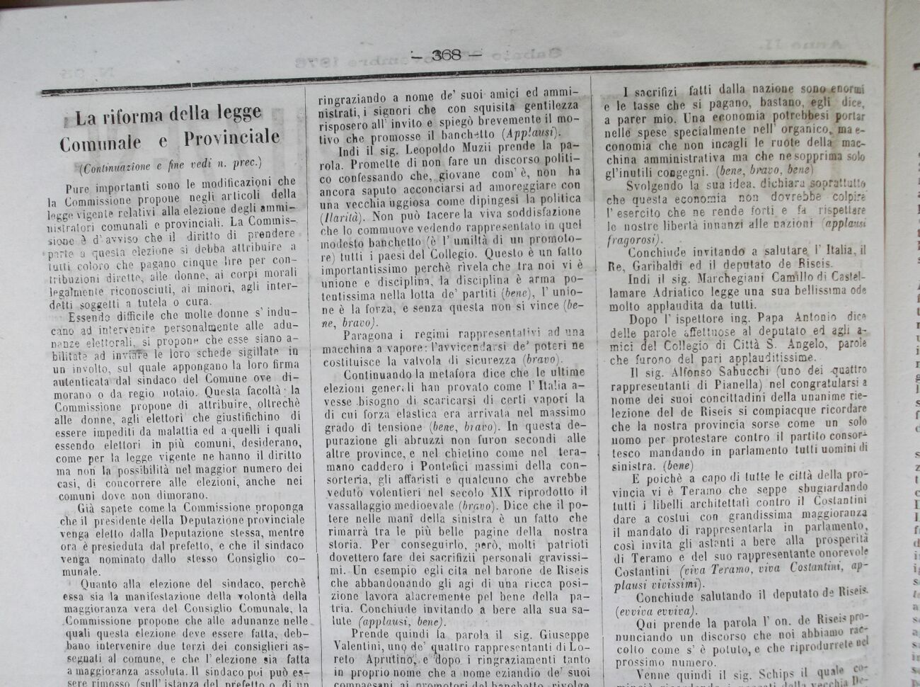 II sig. Alfonso Sabucchi (uno dei -quattro rappresentanti di Pianella) nel congratularsi a nome dei suoi concittadini della unanime rielezione del de Riseis si compiacque ricordare che la nostra provincia sorso come un solo uomo per protestare contro il partito con sor-tesco mandando in parlamento tutti uomini di sinistra, (bene)