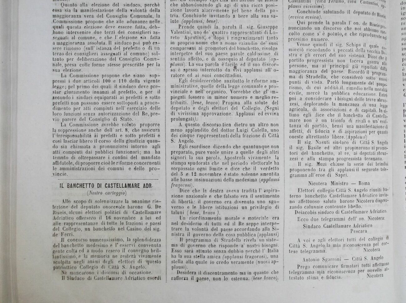 Allo scopo di solennizzare la unanime rielezione del deputato onorevole barone G. De Riseis, alcuni elettori politici di Castellamare Adriatico offersero il 16 novembre a lui ed alle rappresentanze di tutte le frazioni e paesi del Collegio, un banchetto nel Casino del sig. xle' Ferri.