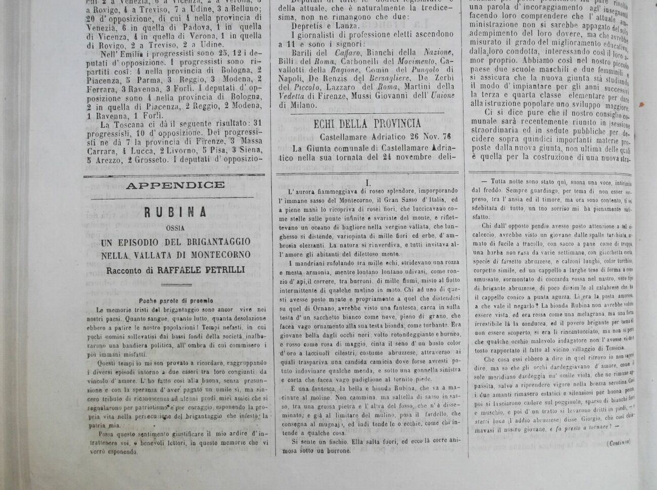 Neil' Emilia i progressisti sono 25, 12 i deputati d'opposizione. I progressisti sono ripartiti cosi: 4 nella provincia di Bologna, 2 Piacenza, 5 Parma, 3 Reggio, 3 Modena, 2 Ferrara, 3 Ravenna, 3 Forlì. I deputati d' opposizione sono 4 nella provincia di Bologna, 2 in quella di Piacenza, 2 Reggio, 2 Modena, 1 Ravenna, 1 Forlì. La Toscana ci dà il seguente risultato: 31 progressisli, 10 d' opposizione. Dei progressisti né dà 7 la provincia di Firenze, 3 Massa Carrara, 4 Lucca, 2 Livorno, 5 Pisa, 3 Siena, 5 Arezzo, 2 Grosseto. I deputati d1 opposizio- APPENDIGE RUBINA OSSIA UN EPISODIO DEL BRIGANTAGGIO NELLA VALLATA DI MONTECORNO Racconto di RAFFAELE PETRILLI Poohs parole di proenlo Le memorie tristi del brigantaggio sono ancor vive nei nostri paesi. Quanto sangue, quanto lutto, quanta desolazione ebbero a patire le nostre popolazioni ! Tempi nefasti, in cui pochi -uomini sollevatisi dai bassi fondi della società, inalbo? rarono una bandiera politica, all' ombra di cui commisero i più immani misfatti. Questi tempi io mi son provato a ricordare, raggruppando i diversi episodi intorno a due esseri ira loro congiunti da vincolo d' amore. L' ho fatto cosi alla buona, senza presunzione e con la speranza d' aver pagato un umile sì, ma sincero tributo di rionoscenza ad alcuni prodi miei amici che si f«gallarono per patriolismo'V por coraggio, esponendo la propria. vita nella pcriecu.iqjie de] brigantaggio che infesti la patria jnia. . , Possa questo sentimento giustificare il mio ardire d'in-lr attener e voi, e benevoli lettori, in queste memorie che vi verrò esponendo. l/vputatl Ul HI l IV IV UUUIUI ivgiaiu>ui v V della attuale, cho è naturalmente la tredicesima, non ne rimangono che due: Depretis e Lanza. I giornalisti di professione eletti ascendono a 11 e sono i signori: Barili del Caffaro, Bianchi della Nazione, Billi del Roma, Carbonelli del Movimento, Cavallotti della Ragione, Comin del Pungolo di Napoli, De Renzis del Bersagliere, De Zerbi del Piccolo, Lazzaro del Roma, Martini della Vedetta di Firenze, Mussi Giovanni dell1 Unione di Milano. ECHI DELLA PROVINCIA Castellamare Adriatico 26 Nov. 76 La Giunta comunale di Castellamare Adriatico nella sua tornata del 24 novembre deli una parola $¦ incoraggiamento agi1 insegnati? facendo loro comprendere che 1' attuale {J1 ministrazione non si sarebbe appagato del$ adempimento del loro dovere, ma cheavrebb misurato il grado del miglioramento educativo dal,aaloro condotta, interessando cosi il loro al ' mor proprio. Abbiamo così nel nostro pìccolo paese due scuole maschili e due femminili « si assicura che la nuova giunta sia studiando il modo d1 impiantare per gli anni successivi la terza e quarta classe elementare per dare alla istruzione popolare uno sviluppo maggiore Ci si dice pure che il nostro consiglioco^. munale sarà recentemente riunito in (sessione straordinaria ed in sedute pubbliche per de- 1 cidere sopra quindici importanti materie prò- f poste dalla nuova giunta, non ultima delle quali f è quella per la costruzione di una nuova stra- le L'aurora fiammeggiava di roseo splendore, imporporando V immane sasso del Montecorno, il Gran Sasso d'Italia, ed a piene mani lo ricopriva di rosei fiori, che luccicavano come stelle sulle punte infinite e svariate del monte, e riflettevano un oceano di bagliore nella vergine vallata, che lunghesso si distende, variopinta di mille fiori ed erbe, d' ambrosia olezzanti. La natura si rinverdiva, e tutti invitava all' amore gli abitanti del dilettoso monte. I mandriani zufolando Ira mille echi, stridevano una rozza e mesta armonia, mentre lontano lontano udivasi, come ronzio d' api.il correre, tra burroni, di mille fiumi, misto al fiotto intermittente di qualche mulino in moto. Chi ad uno di questi avesse posto mante e propriamente a quel che distendasi su quel di Ornano, avrebbe visto una fantesca, carca in sulla testa d' un sacchetto bianco come neve, pieno di grano, che facea vago ornamento alla sua testa bionda, come turbante. Era giovane bella dagli occhi neri, volto rotondeggiante eburneo, e rosso come rosa di maggio, cinta il seno d' un busto color d'oro a laociuoli cilestri, costume abruzzese, attraverso ai quali traspariva una candida camicia dove forse avresti potuto indovinare qualche menda, e sotto una gonnella sinistra e corta che facea vago padiglione al tornilo piede. È una fantesca, -la bella e bionda Rubina, che va a macinare al molino. Non cammina, ma saltella di sasso in sasso, tra una grossa pietra e 1 altra del fosso,,.,che n' è disseminato; e già al limitare del mulino, posa il fardello, che consegna al mugnaj >, od indi tonde le o écchie, come chi intende a qualche cosa." Si sente un fischio. Ella salta fuori, ed ecco là corre animosa sotto un burrone. Tutta notte sono stato quìy suona una voce, intirizzito dal freddo. Sempre guardingo, per tema di non esser sorpreso, tra 1' ansia ed il timore, ma ora sono conlento, li sei sdebitata dì tutto, un tuo sorriso mi ha pienamente sili-sfatto. Chi dall' opposto pendio avesse posto attenzione a l«l cicaleccio, avrebbe visto un giovane dalle spalle tarchiati, armato di fucilo a tracollo, con sacco a pane come di truppa, una barba non rasa da varie settimane, con giacchetta corti, specie di farsetto abruzzese, e calzoni lunghi, color turchino, corpetto simile, ed un cappello a larghe lese di forma a cono smussato, sormontalo di coccarda rossa nel nastro, véro tipo di brigante abruzzese, di poco dissim'Ie al calabrese che hi il cappello conico a punta aguzza. Lì,era la posta amorosa, a che vale il negarlo? La bionda Rubina non avrebbe volalo essere vista, ed era rossa come una melagrana, ma una fora investibile là la oonducca, ed il povero brigante per temi 11 non essere scoperto, si era lì rincantuccialo, ma non sì per» che qualche ocehio malevolo indagatore non l'avesse viA' tosto rapportato il fatto al vicino villaggio di Tossicia. Che cosa essi ebbero a dire in quel rilrovo io non saprei dire, ma so ehe g