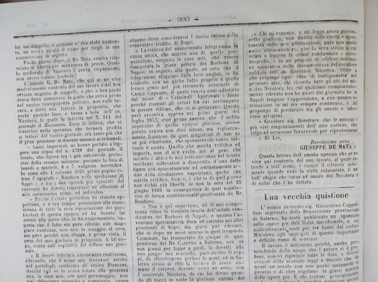 L* onesto G. De Mata, che qui se ne vive modestamente contento del suo lavoro e del ben avvialo negozio di cappelli; e,che a ben pochi aveva fatto conoscere la parte che aveva preso nel nostro risorgimento politico, non volle tacere, e dettò una lettera in proposito, che porta qualche luce, è torna a lode dell' on. Nicotera; la quale fu inserita nel N. 314 del giornale il Movimento. Ecco la lettera,- che vi trascrivo nella speranza che tornerà gradita ai lettori del vostro giornale, ora tanto più che il gran processo si discute innanzi ai tribunali.