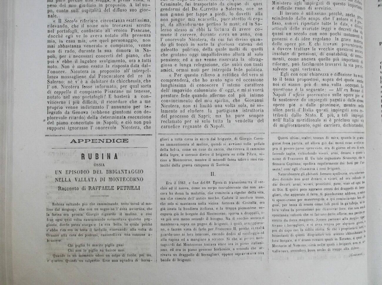 « Amici imparziali mi hanno portato a leggere una copia del n. 3790 del giornale il Secolo, che figura tra i più autorevoli periodici della stampa milanese: portante la data di lunedì e martedì, 6 e 7 volgente novembre. In cima alle 4 colonne della prima pagina rilevo 1' epigrafe », Nicotera n-ìlla spedizione jdi Sapri »;} e fra i due- episodi più spiccali del racconto ho dovuto rimarcaavi un' allusione al mio oscurissimo nome, ed individuo.