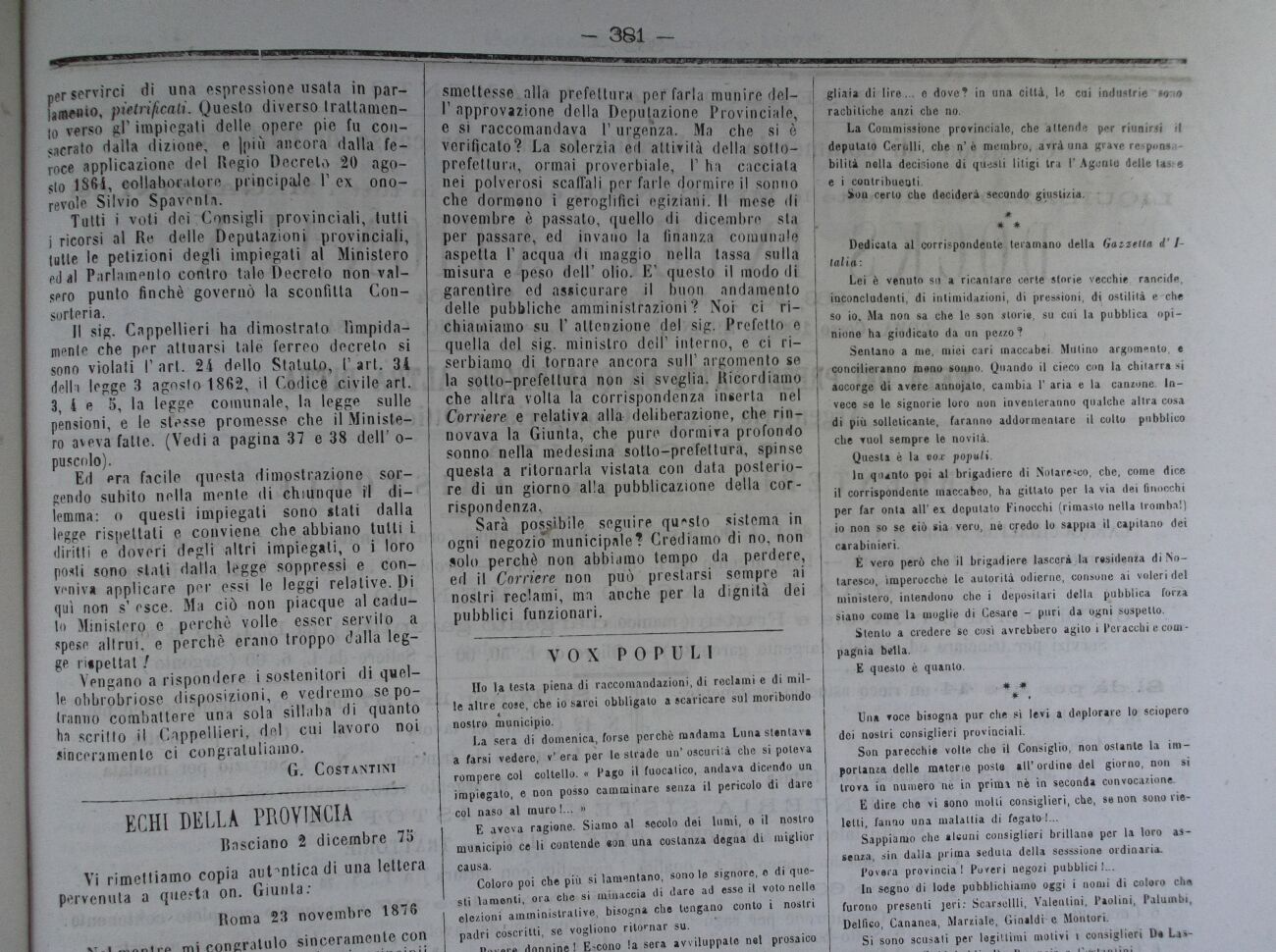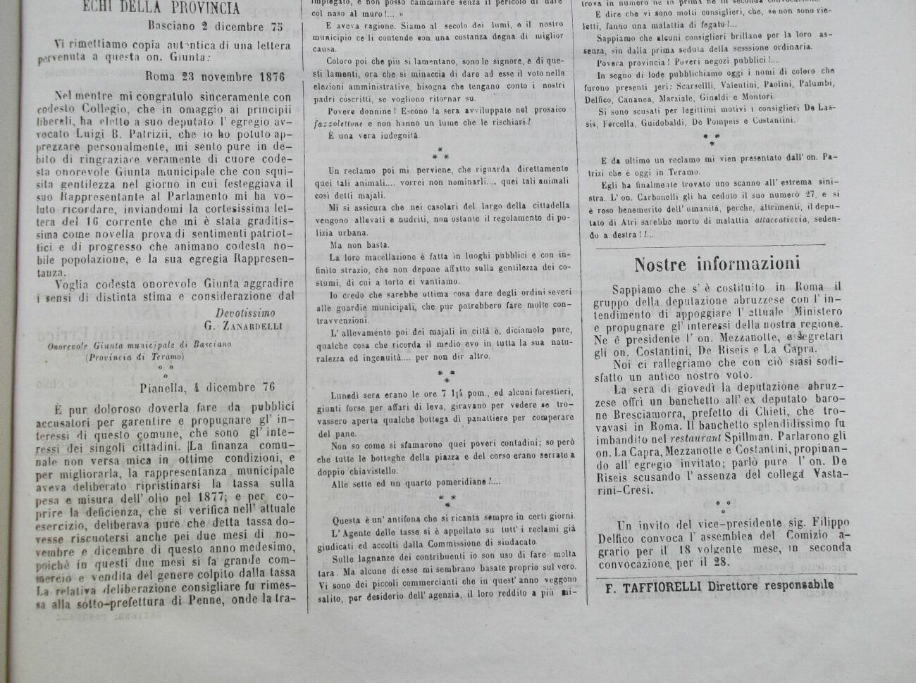 È pur doloroso doverla fare da pubblici accusatori per garentire e propugnare gì' interessi di questo Qomune, che sono gì' interessi dei singoli cittadini. ,La finanza comunale non versa mica in ottime condizioni, e per migliorarla, la rappresentanza municipale aveva deliberato ripristinarsi la tassa sulla pesa e misura dell' olio pel 1877; e per coprire la deficienza, che si verifica nell' attuale esercizio, deliberava pure che delta tassa dovesse riscuotersi anche pei due mesi di novembre e dicembre di questo anno medesimo, poiché in questi due mesi si fa grande commercio e vendita del genere colpito dalla tassa La relativa deliberazione consigliare fu rimessa alla sotto-prefettura di Penne, onde la Ira-